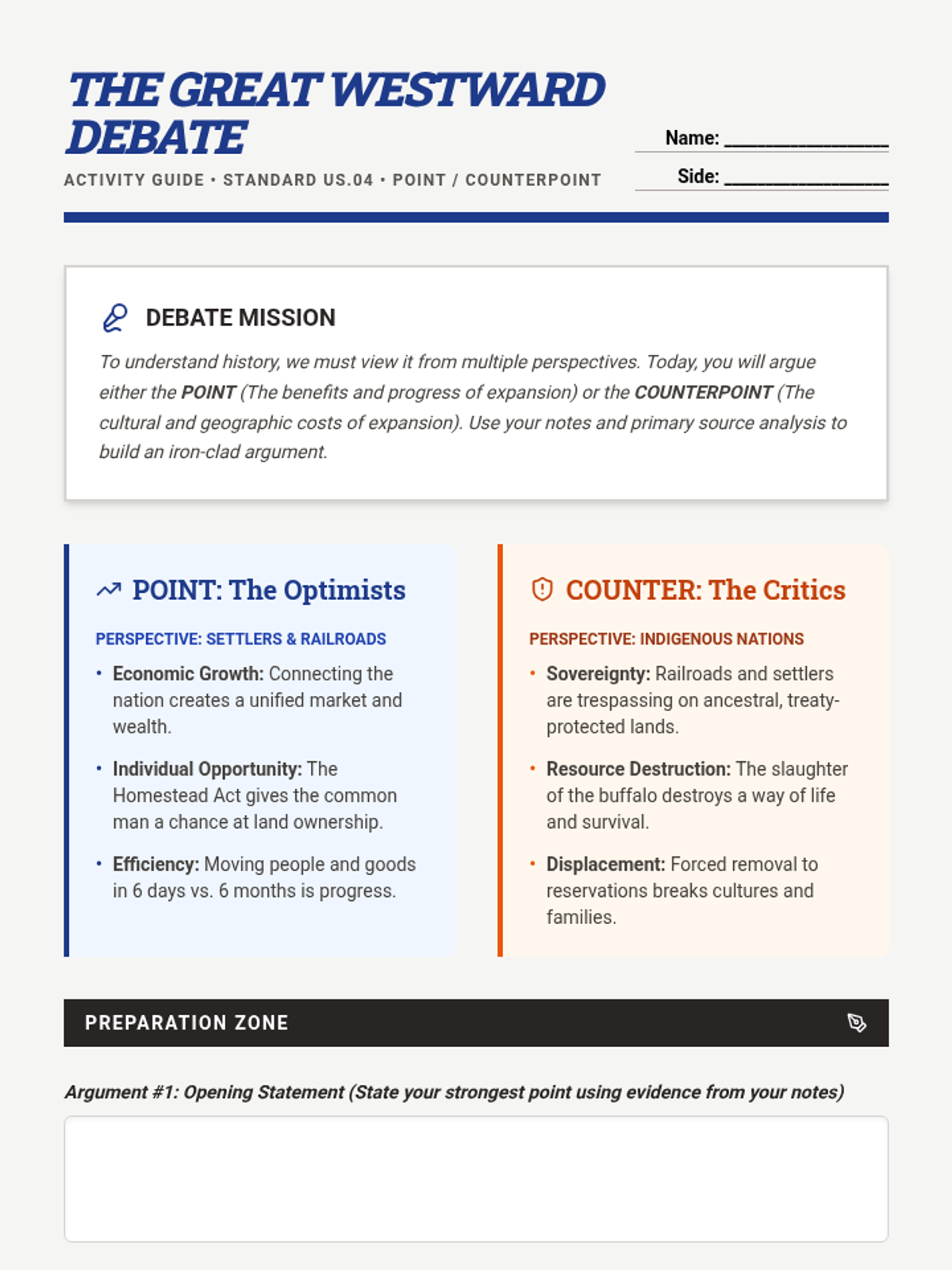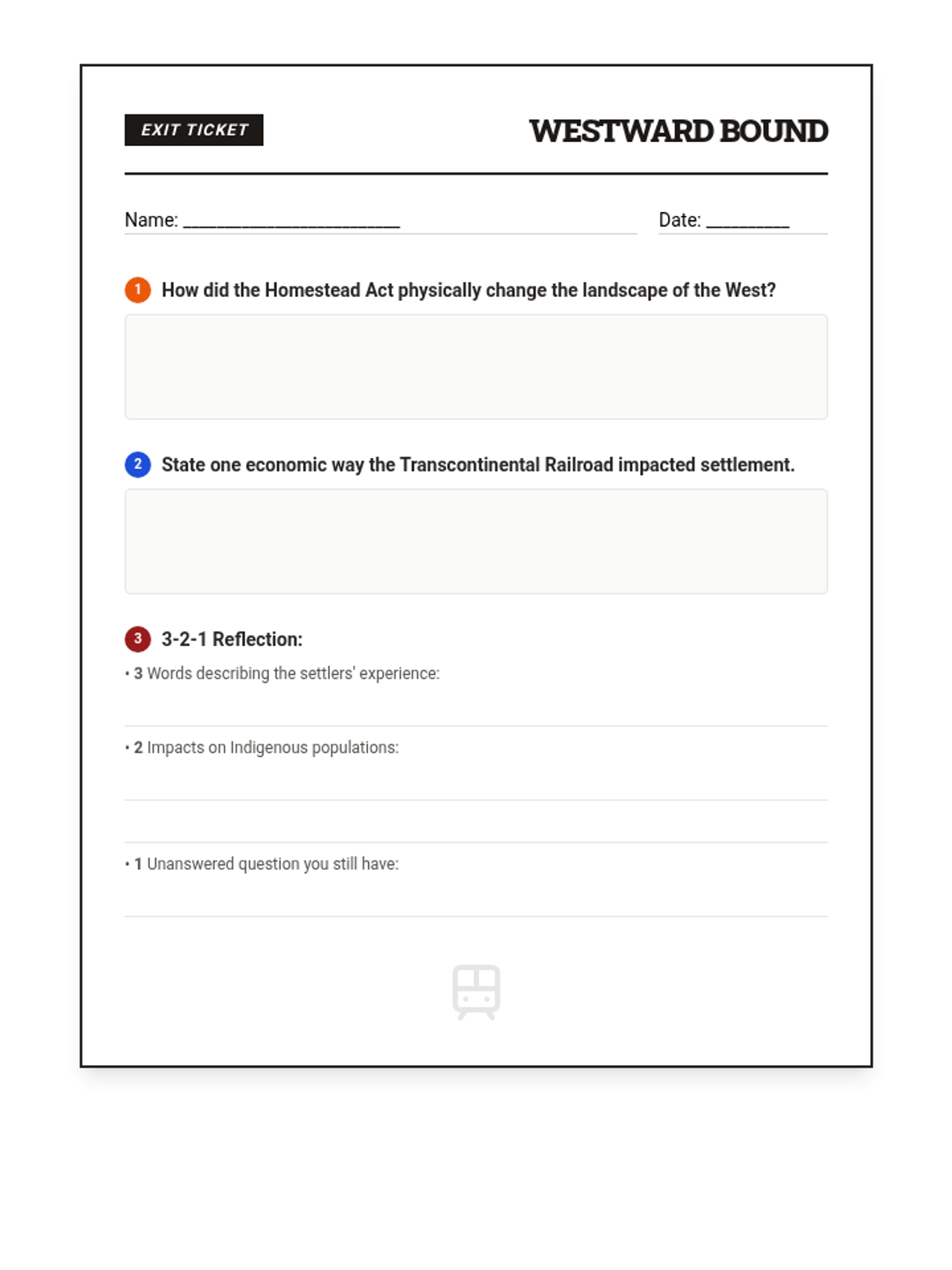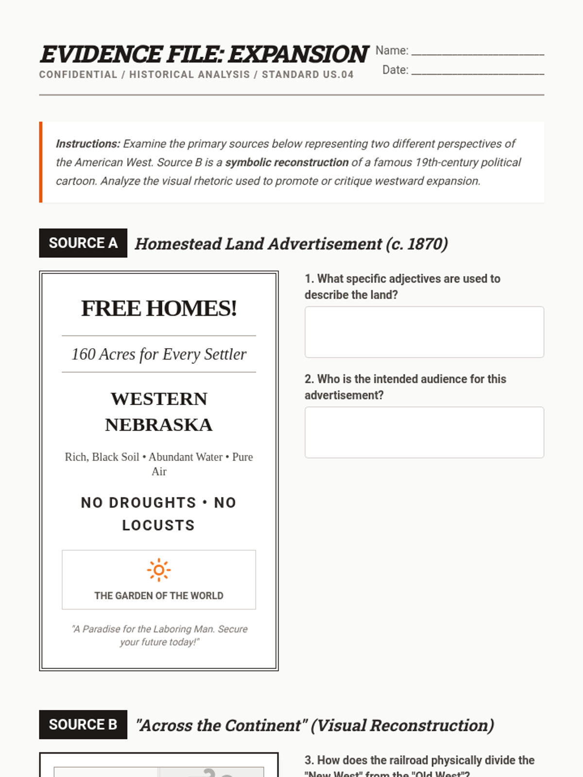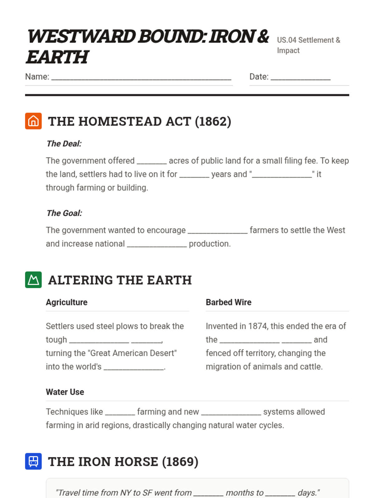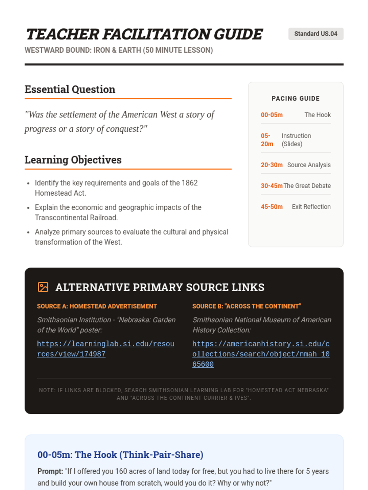 This lesson explores Tennessee State Standard US.04, focusing on the Homestead Act and the Transcontinental Railroad's roles in settling the American West and their subsequent impact on the physical and cultural landscape. Students will engage with primary sources, guided notes, and a structured debate to understand the multifaceted consequences of westward expansion.