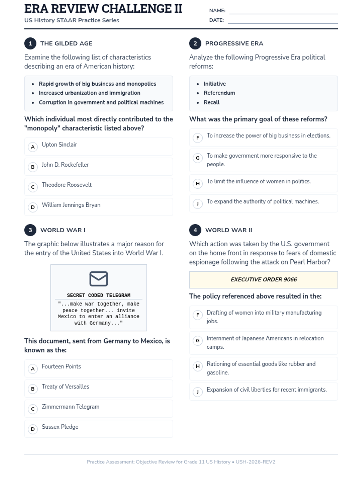 Covers the Spanish-American War, US Imperialism, the Panama Canal, and the causes/impacts of World War I.