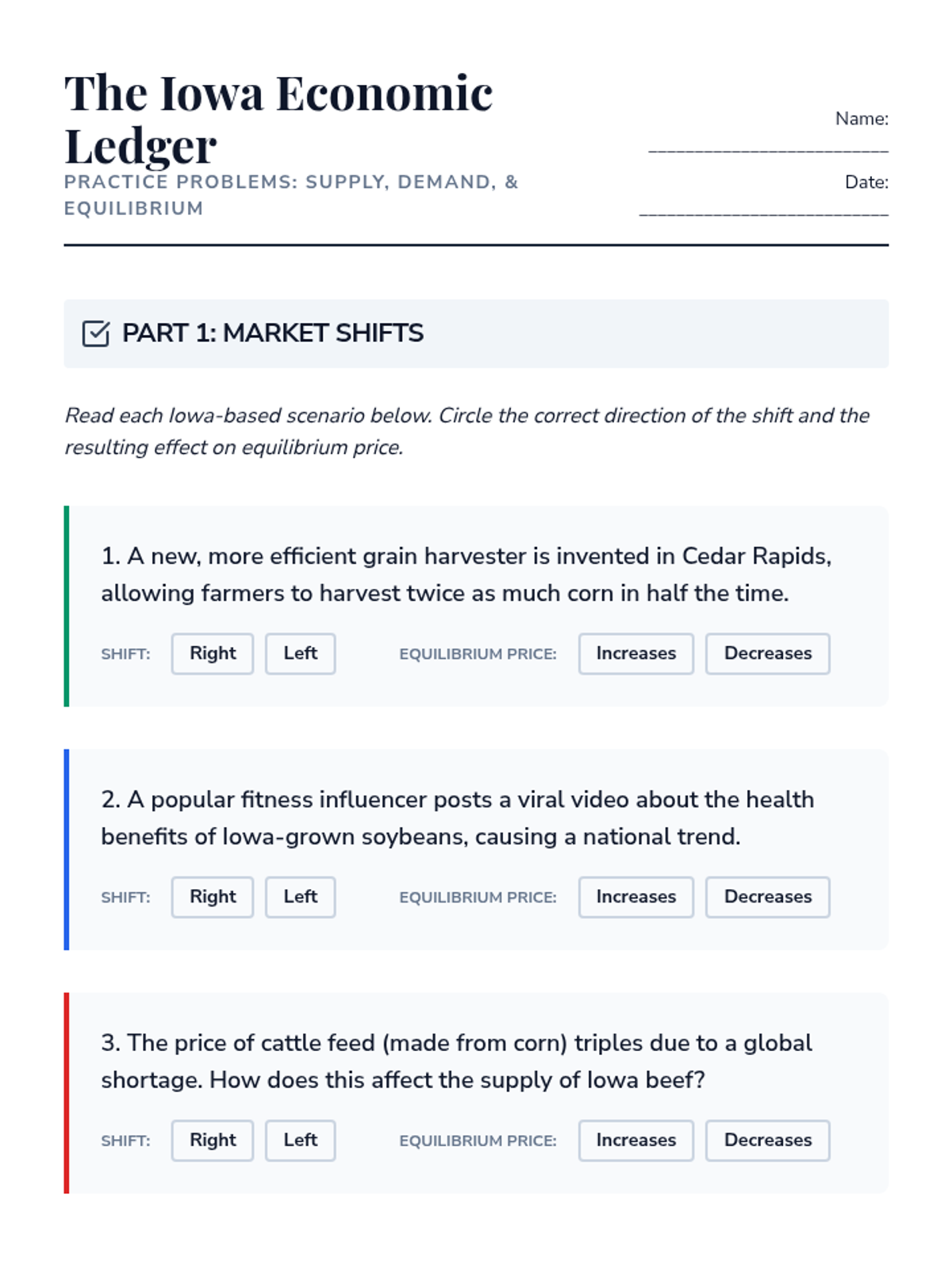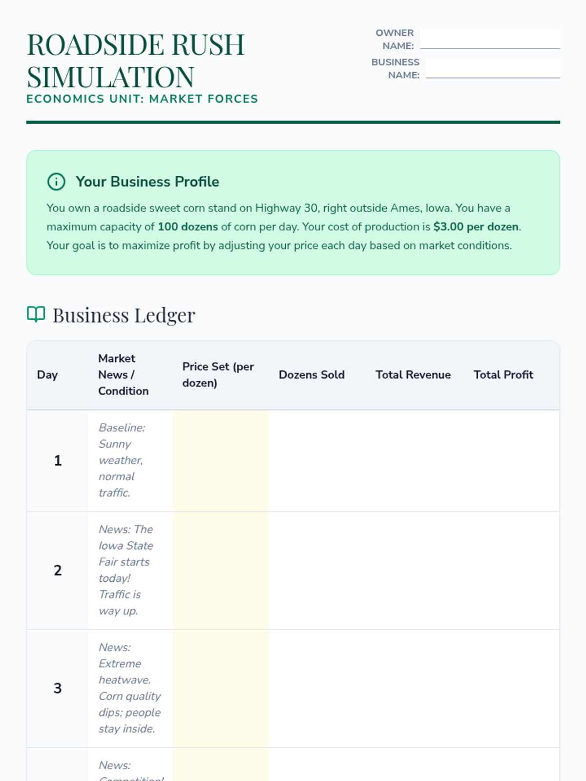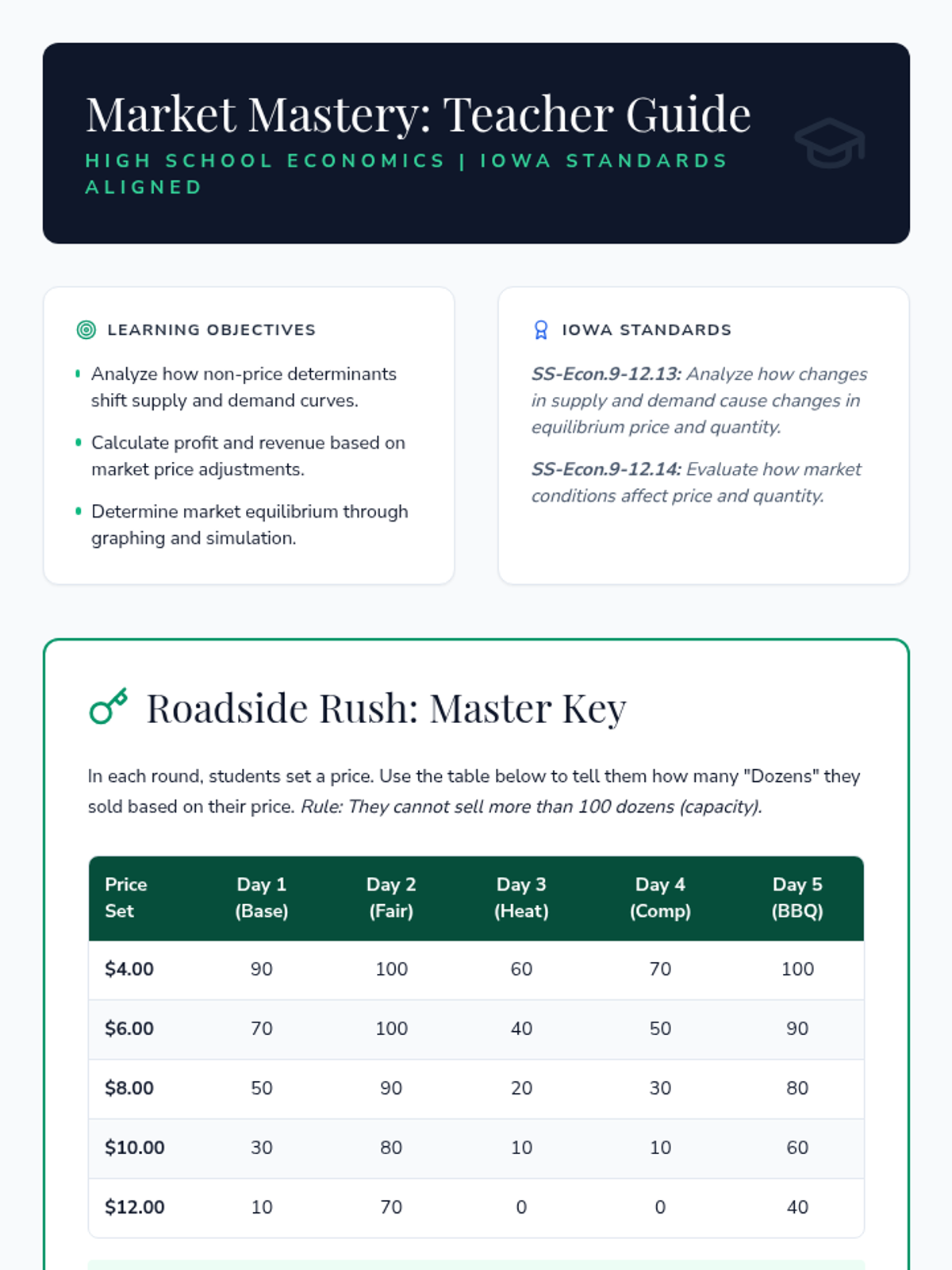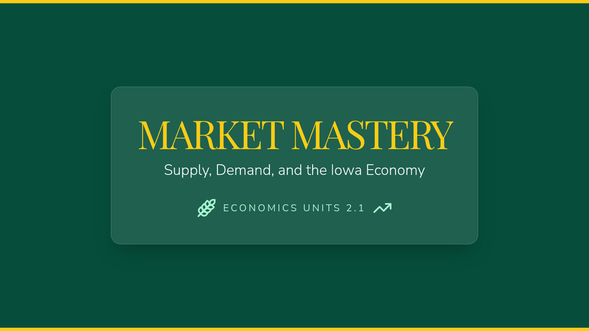 A high-school economics lesson exploring the fundamental principles of supply, demand, and market equilibrium through the lens of Iowa's agricultural and local business landscape. Students engage in a hands-on simulation managing a roadside sweet corn stand to see market forces in action.