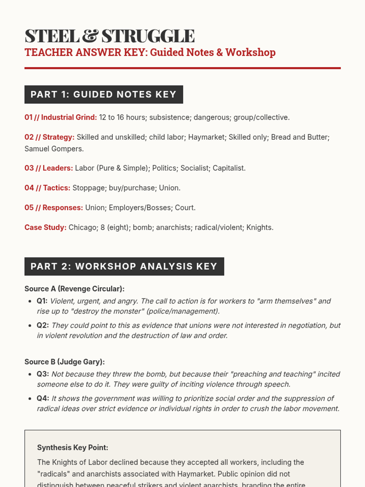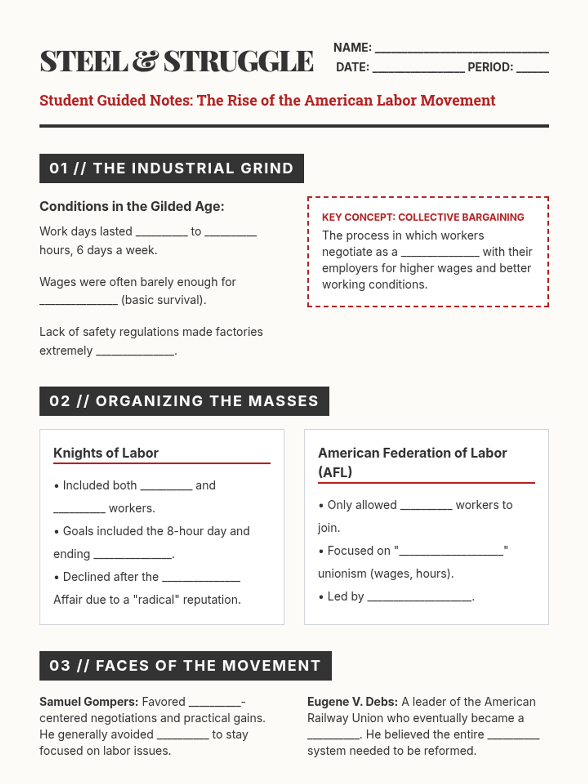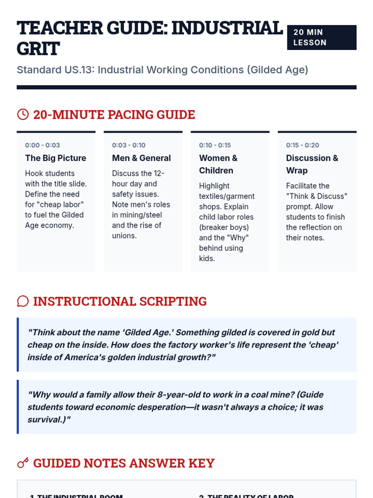 A fast-paced, 20-minute exploration of the harsh realities of industrial labor during the Gilded Age, focusing on the distinct roles and conditions faced by men, women, and children. Students use guided notes to track key economic and social impacts of the era's working conditions.