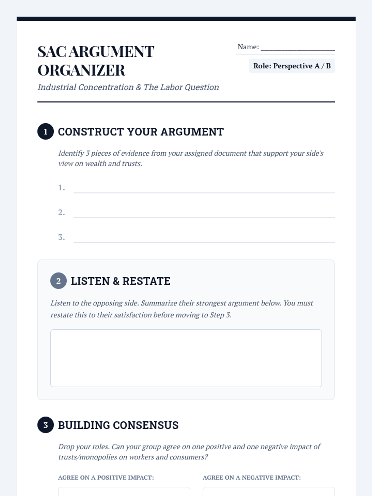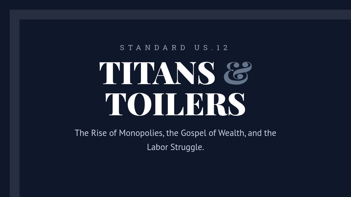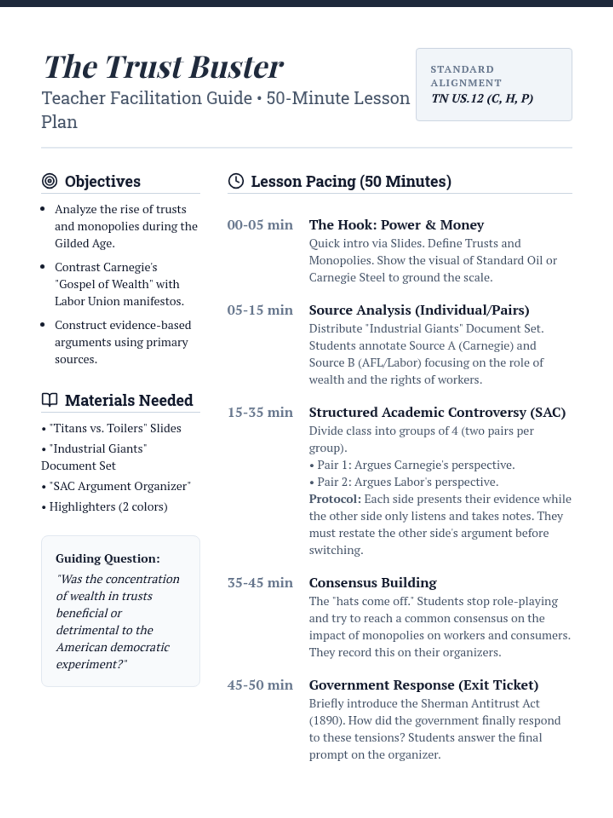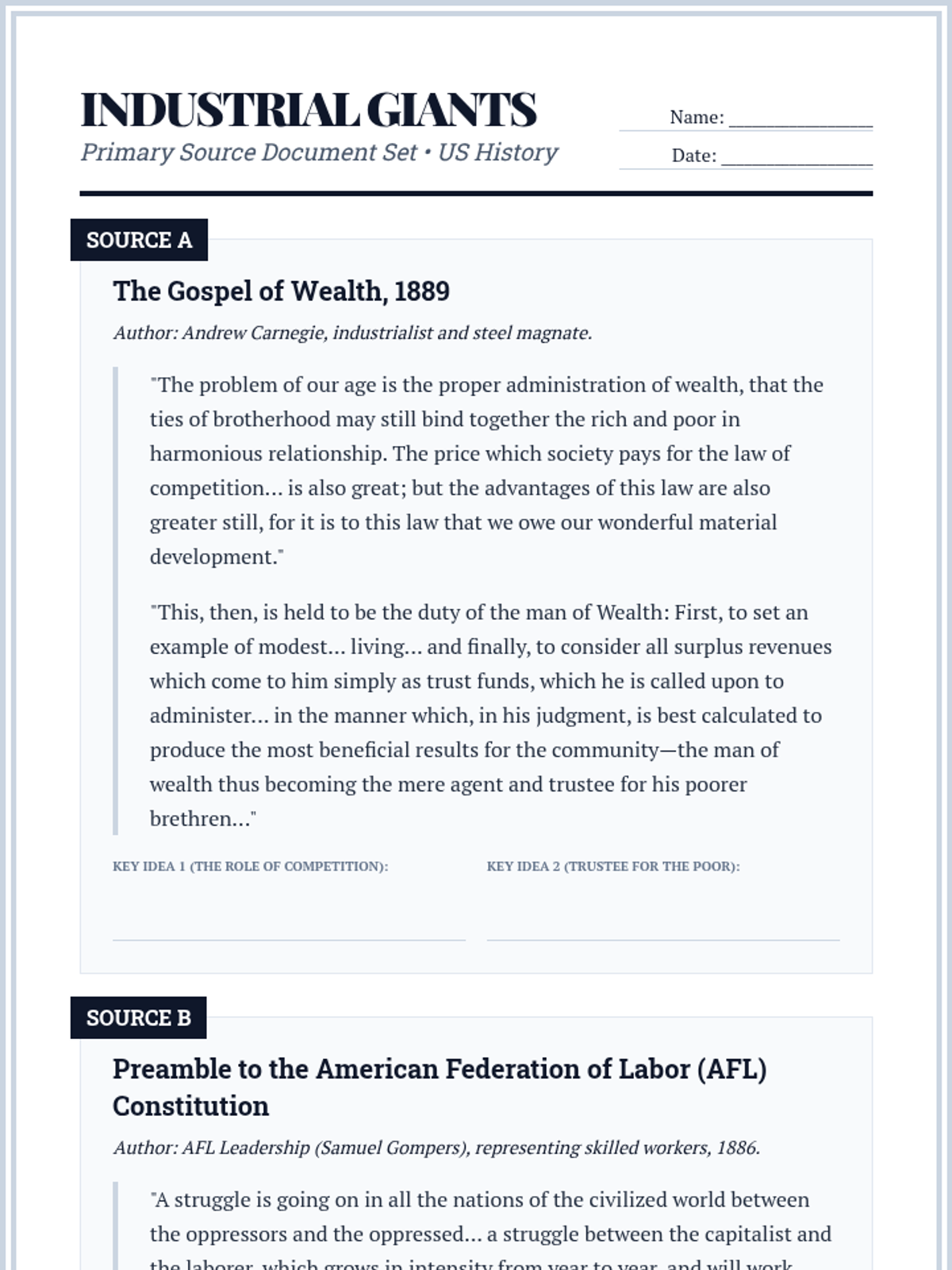 This lesson explores the rise of monopolies and trusts in Gilded Age America, focusing on the conflicting perspectives of industrial leaders and labor unions through a Structured Academic Controversy (SAC). Students analyze Carnegie's 'Gospel of Wealth' and labor manifestos to construct evidence-based arguments regarding the impact of concentrated wealth on society.