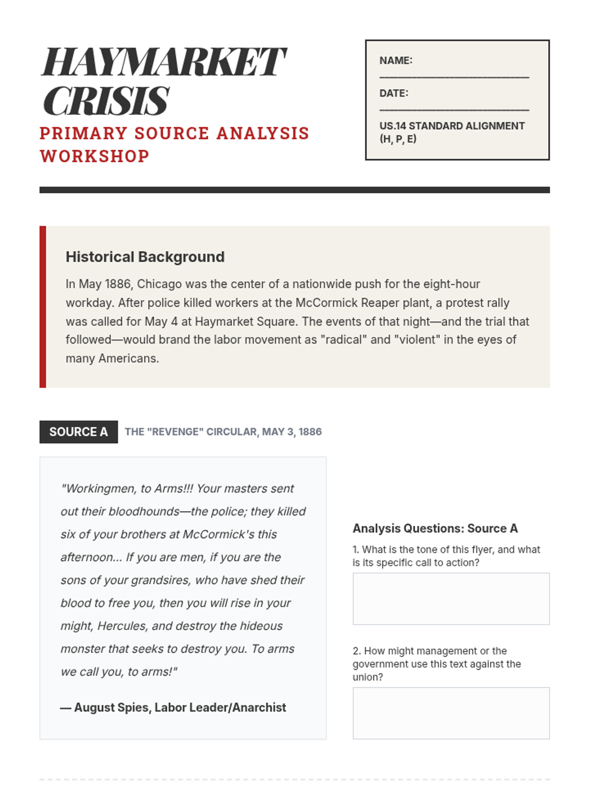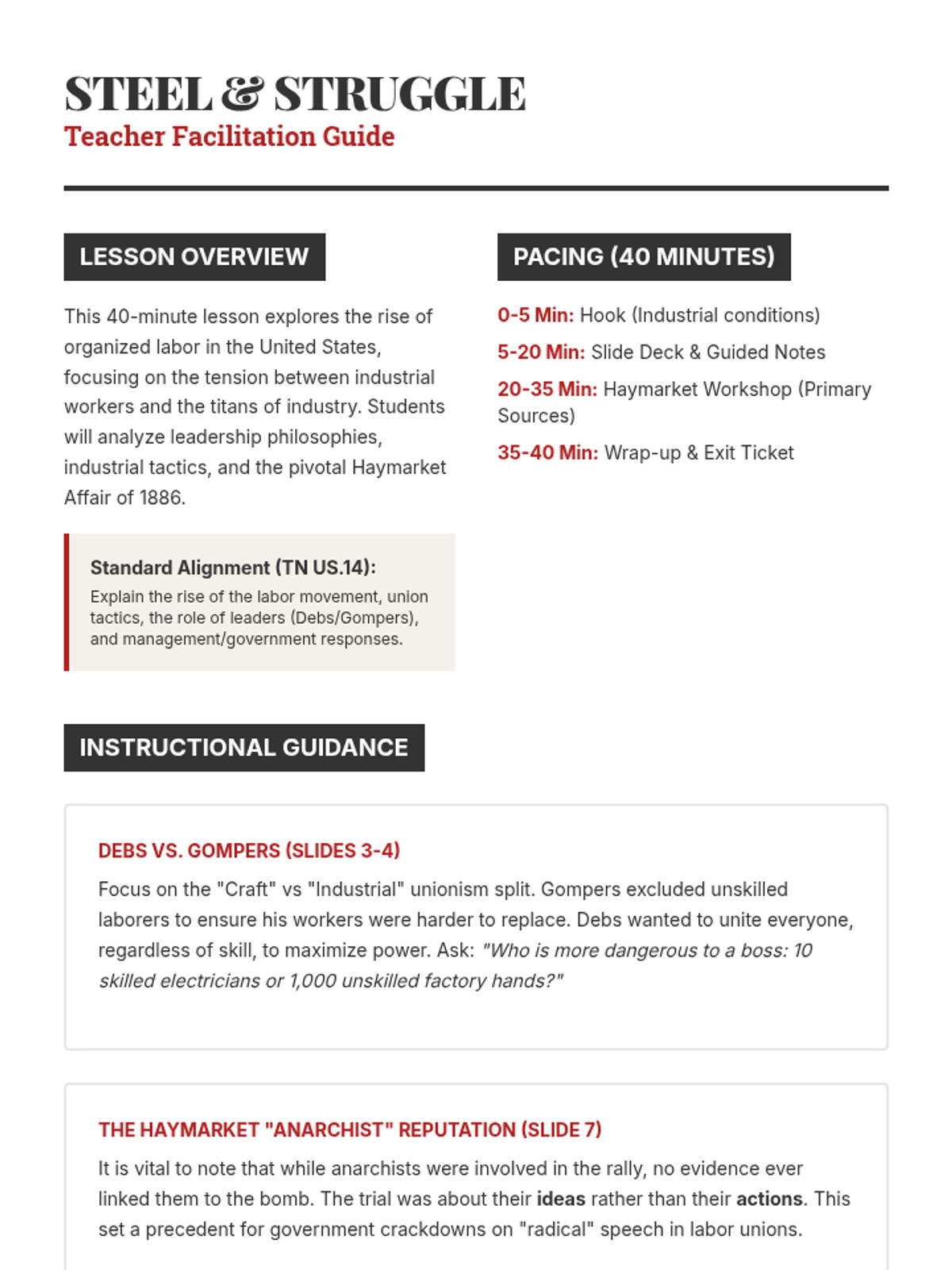 A 40-minute lesson exploring the rise of the American labor movement, key leaders like Gompers and Debs, and the dramatic Homestead Strike of 1892. Students analyze the clash between industrial titans and organized labor through primary sources and guided instruction.