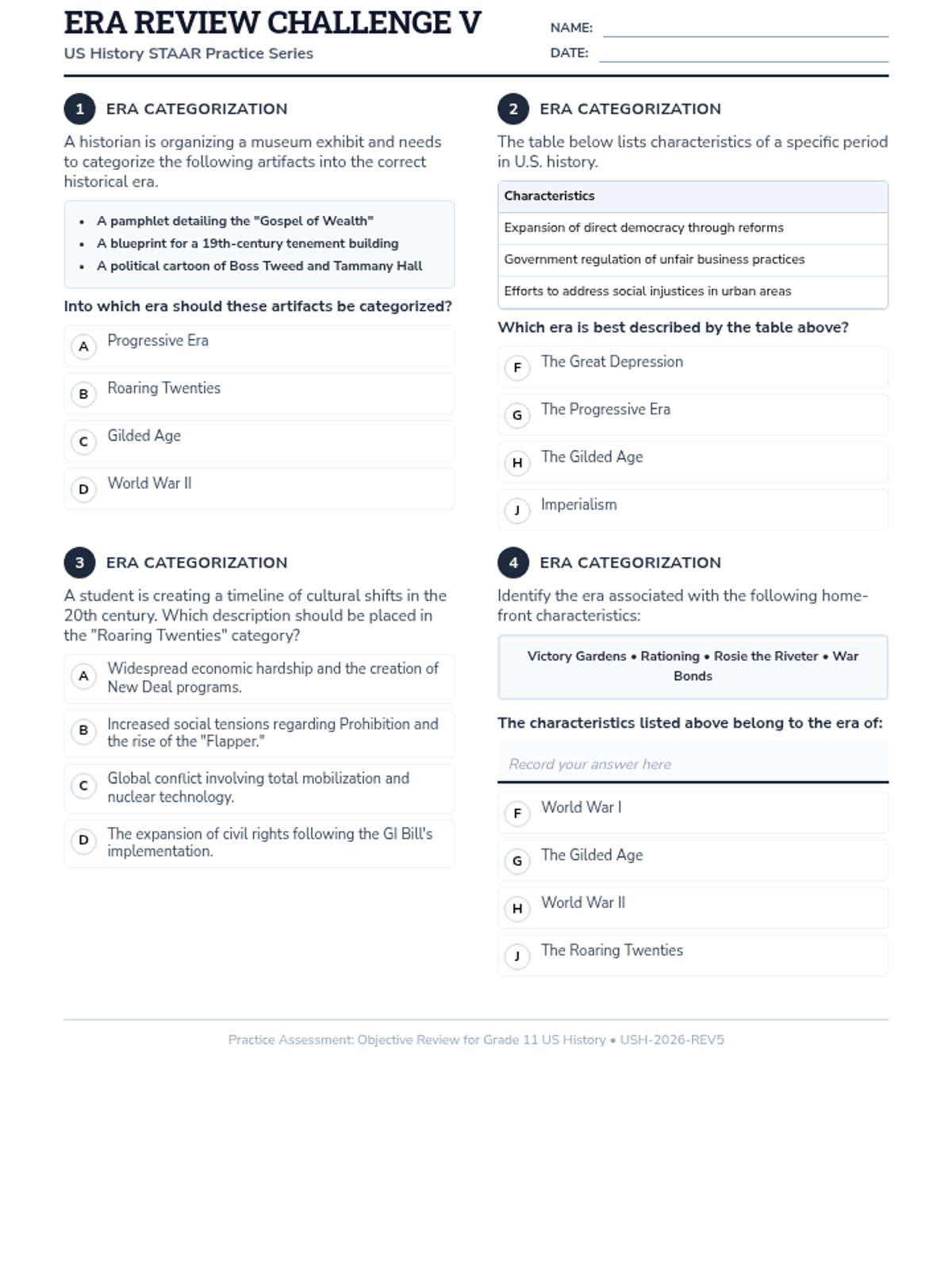 A quick review lesson designed to prepare students for US History STAAR assessments, focusing on four key eras: Imperialism, the Roaring 20s, the Great Depression, and WWII.