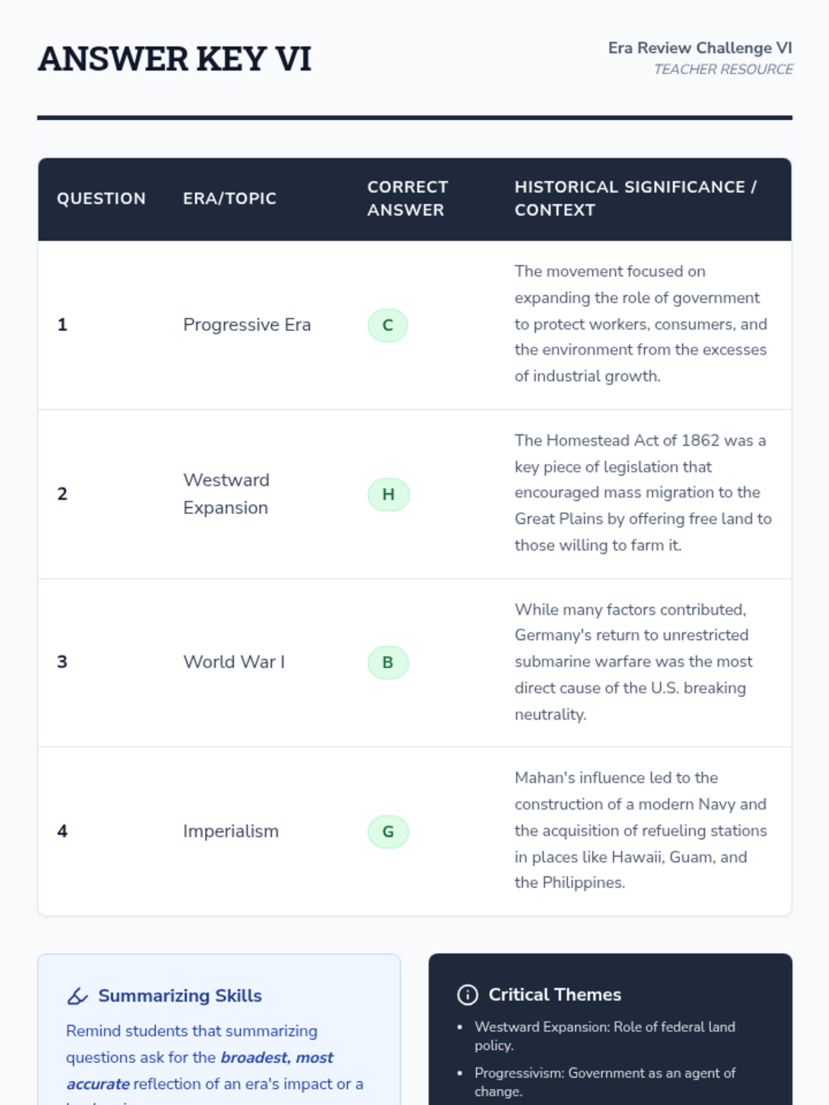A high-speed 25-minute investigation into the three distinct foreign policy styles of the Progressive Era presidents: Roosevelt, Taft, and Wilson. Students use a comparative dossier approach to analyze motives, methods, and outcomes of American expansionism.
