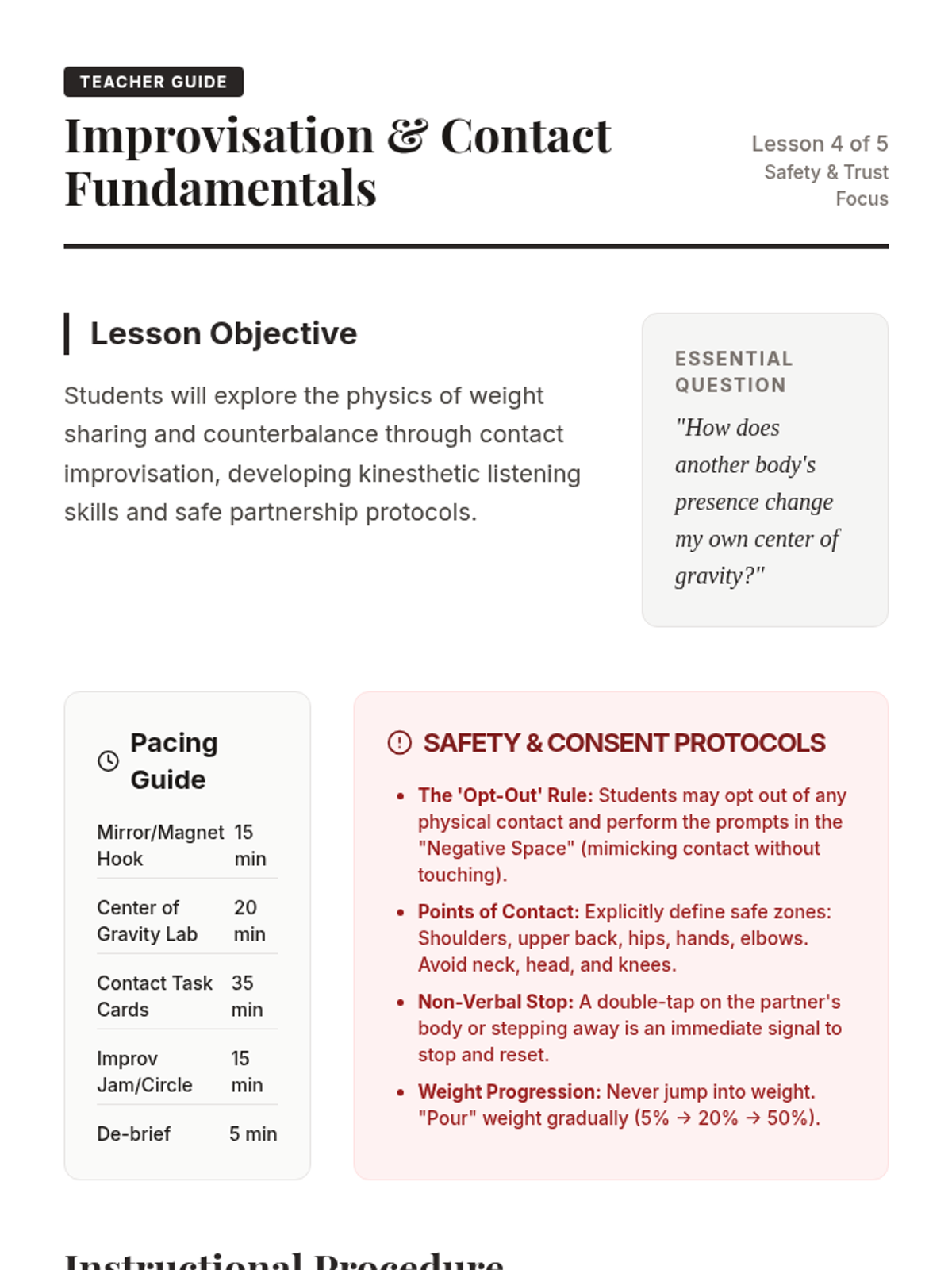 Students investigate the power of the 'stop' or 'freeze' in a rhythmic sequence. They practice freezing on unexpected counts to build core control and dramatic tension.