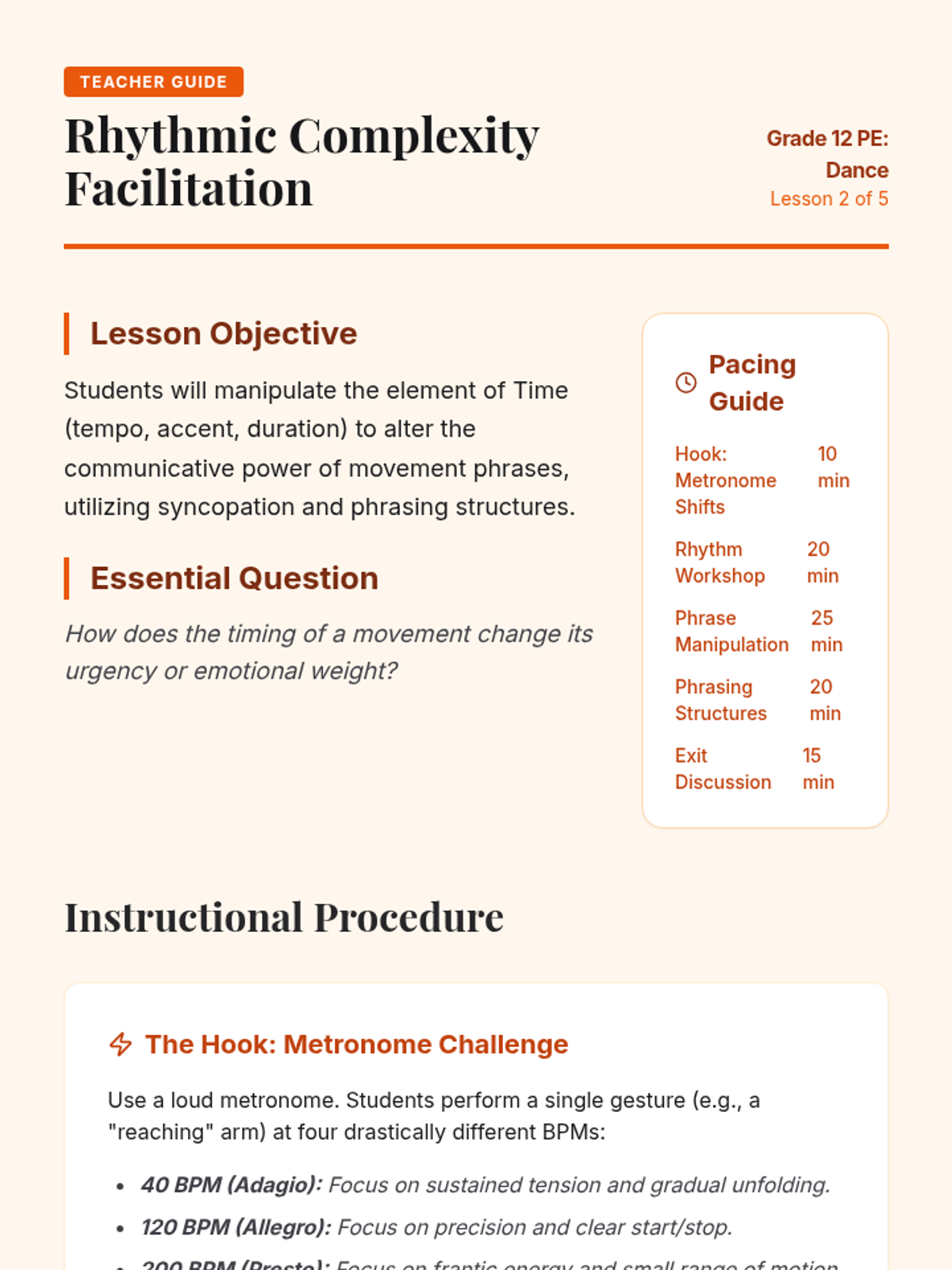 This lesson focuses on manipulating tempo and rhythm, challenging students to execute movement phrases at varying speeds while maintaining technical precision.