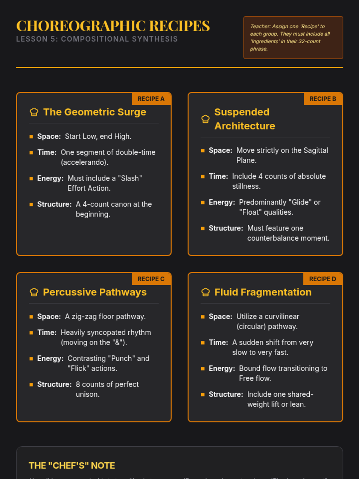 A synthesis of all previous elements through guided improvisation, where students respond to rapid-fire cues to shift their spatial, temporal, and energetic qualities.