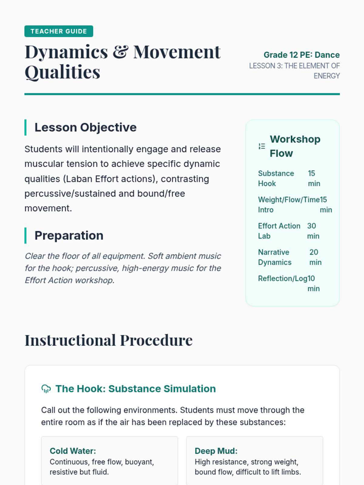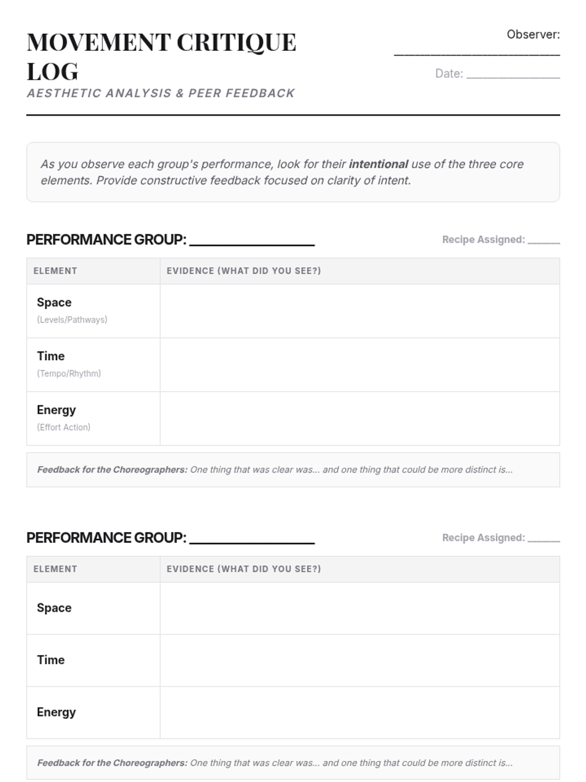 Using their musical maps, students choreograph a short piece that explicitly highlights chosen musical elements. Peer feedback focuses on the clarity of the movement-to-sound relationship.