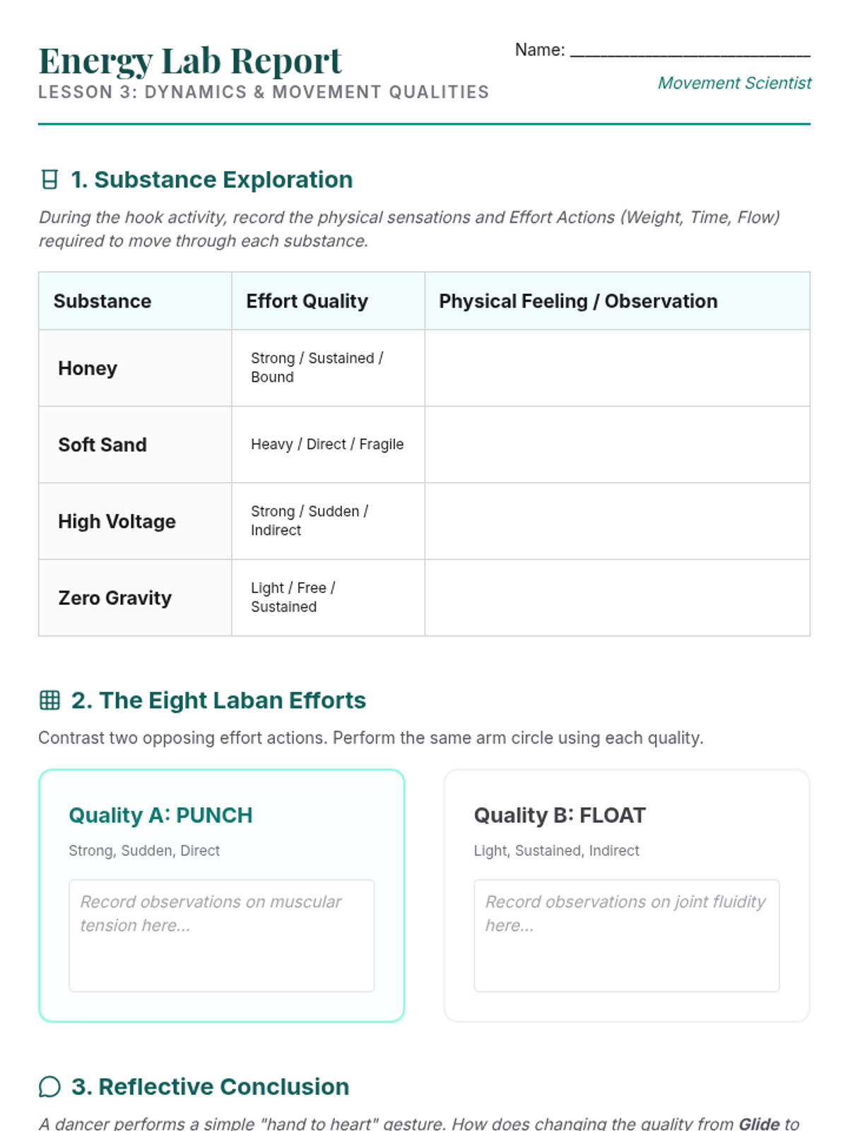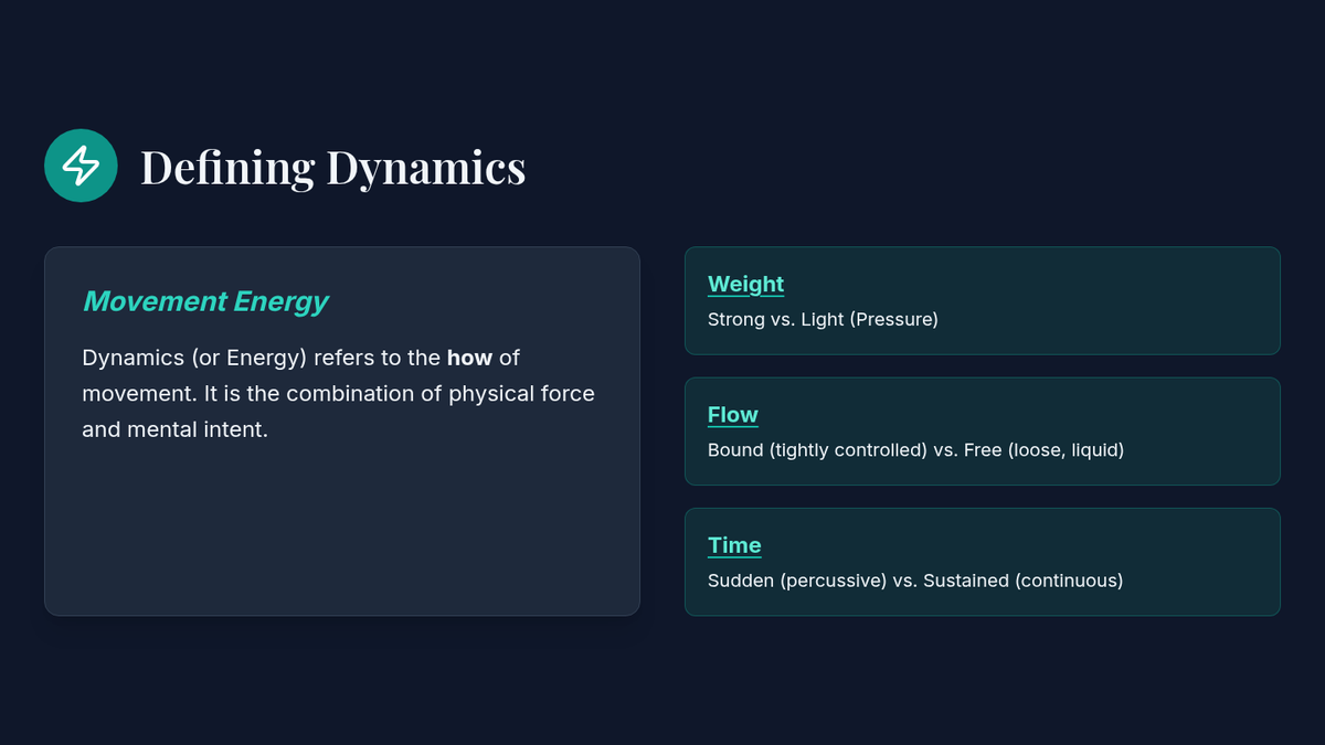 Investigates movement energy and Laban Effort actions, exploring how weight, flow, and tension alter movement quality.
