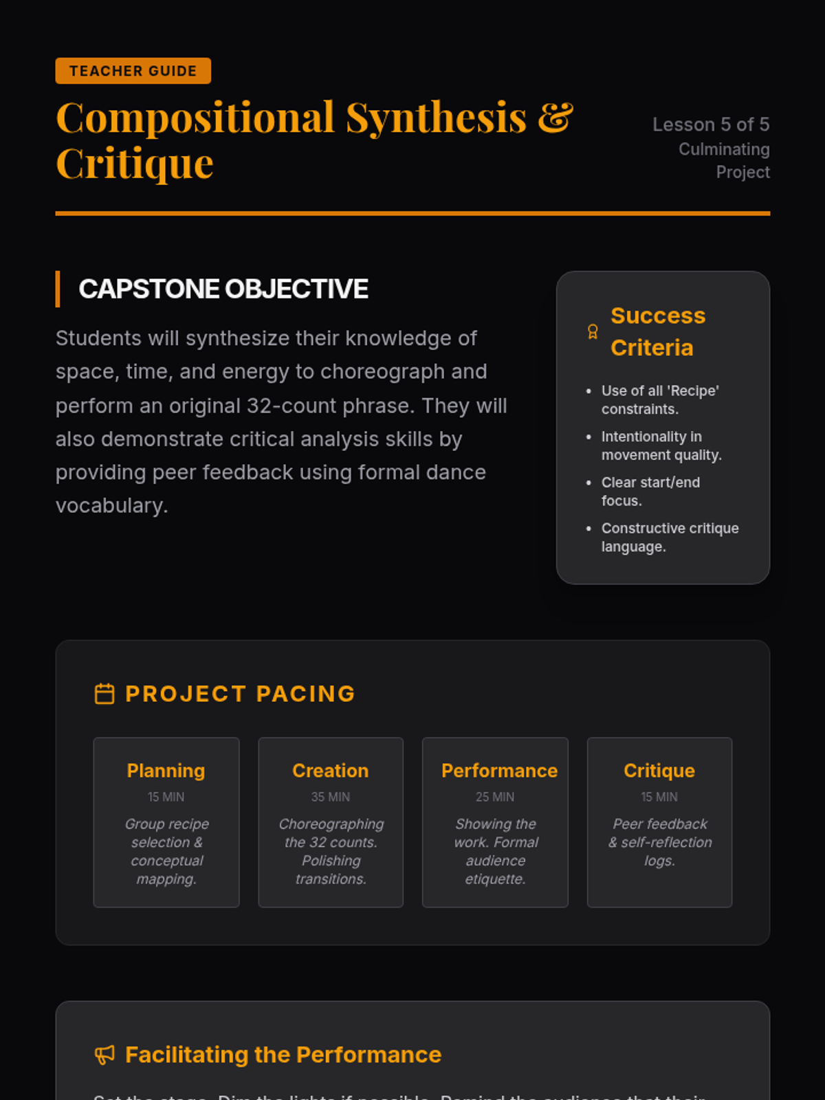 A culminating project where students synthesize space, time, and energy to create and critique original 32-count choreographic phrases.