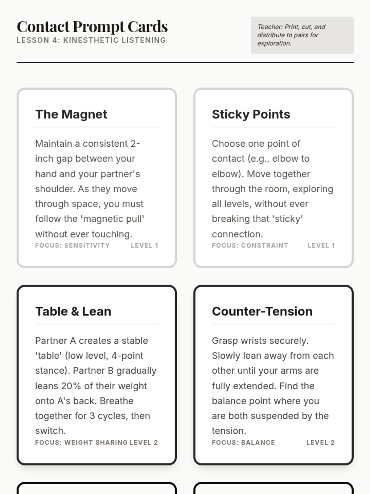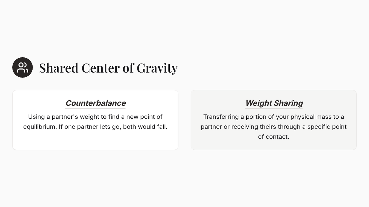 Introduces weight sharing, counterbalance, and kinesthetic listening through contact improvisation and partnership exercises.