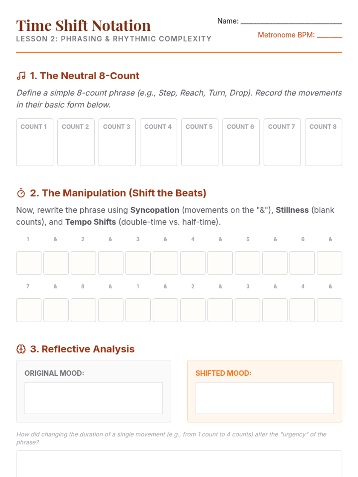 Students take a single movement and perform it over 1 count, 4 counts, and 8 counts. They analyze how the muscular tension and quality of movement change based on the duration allowed.