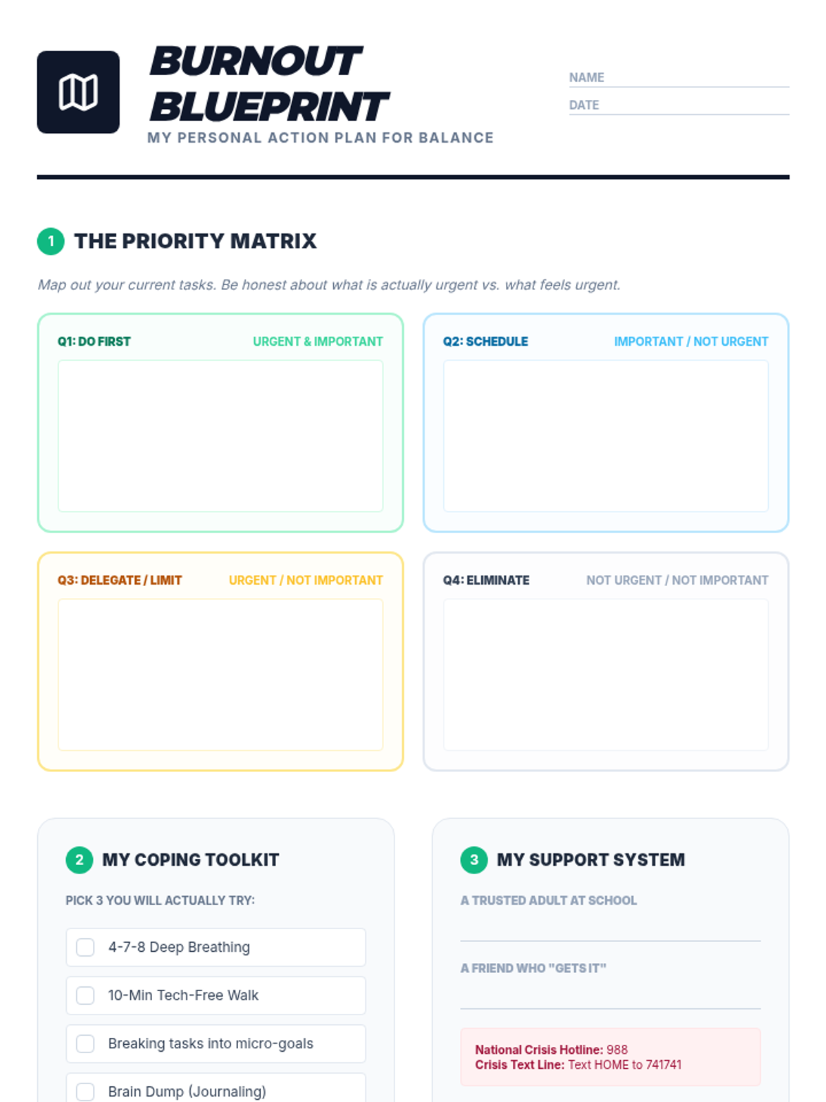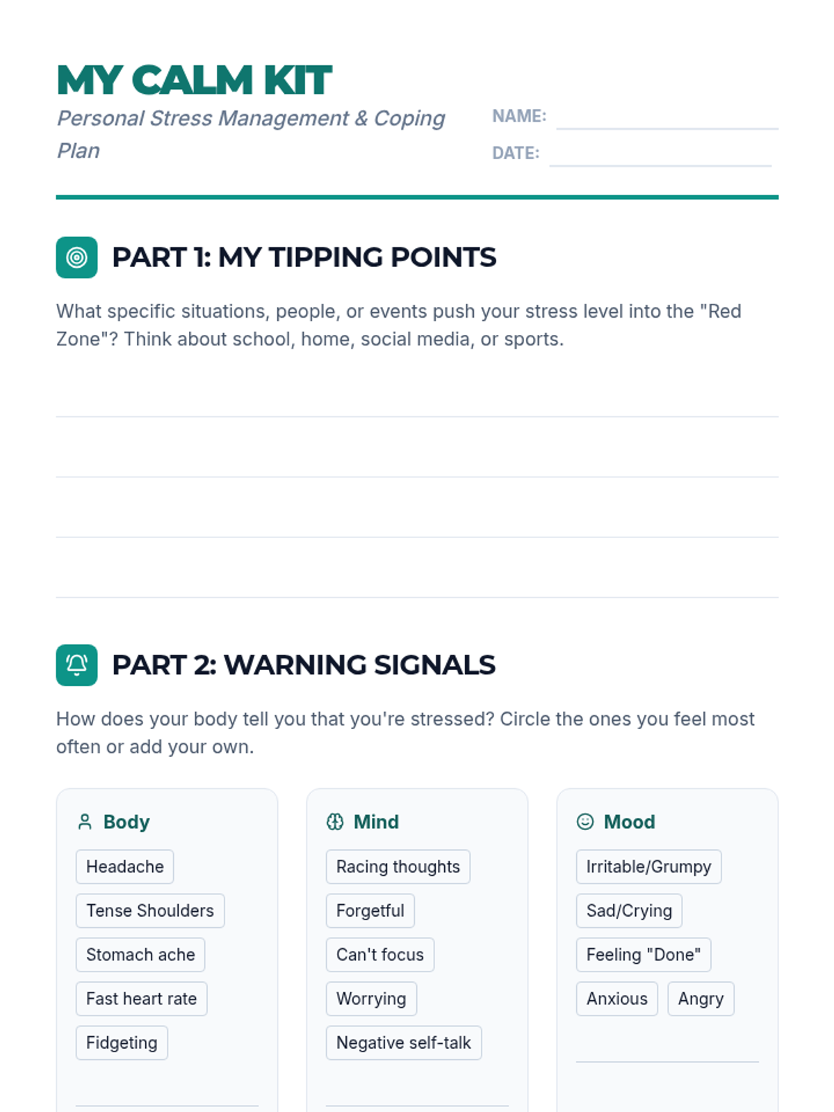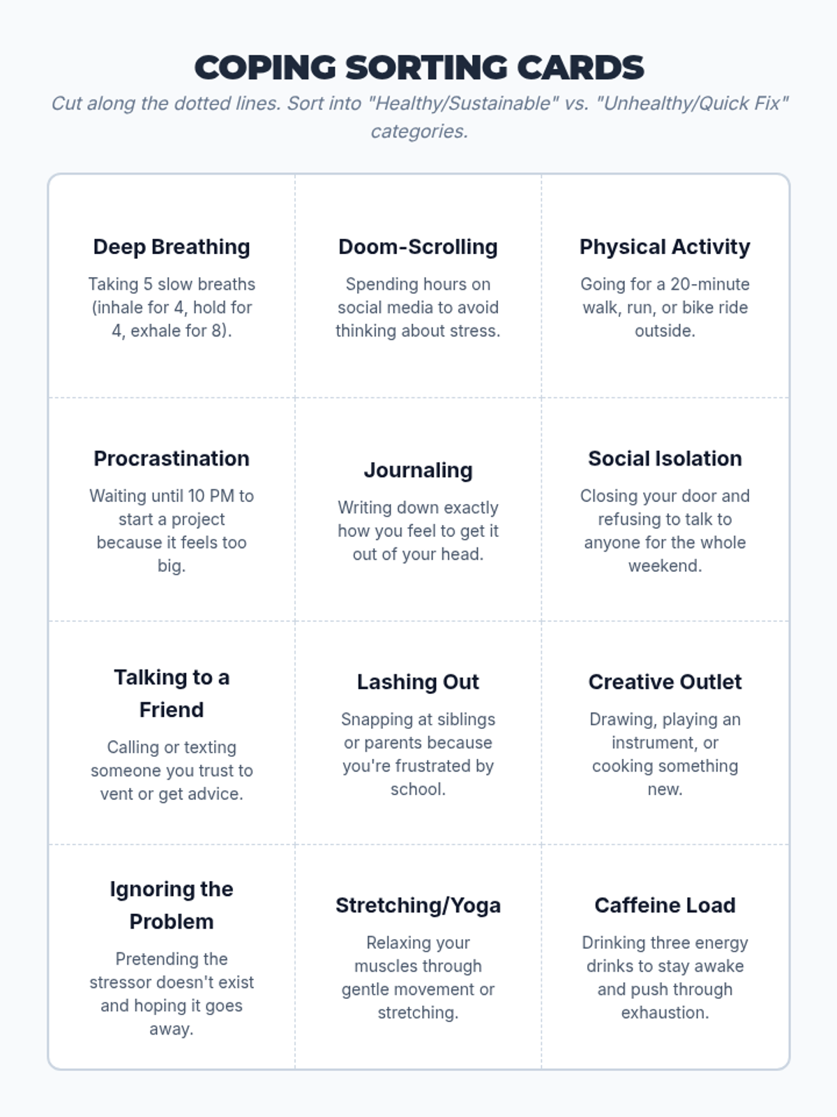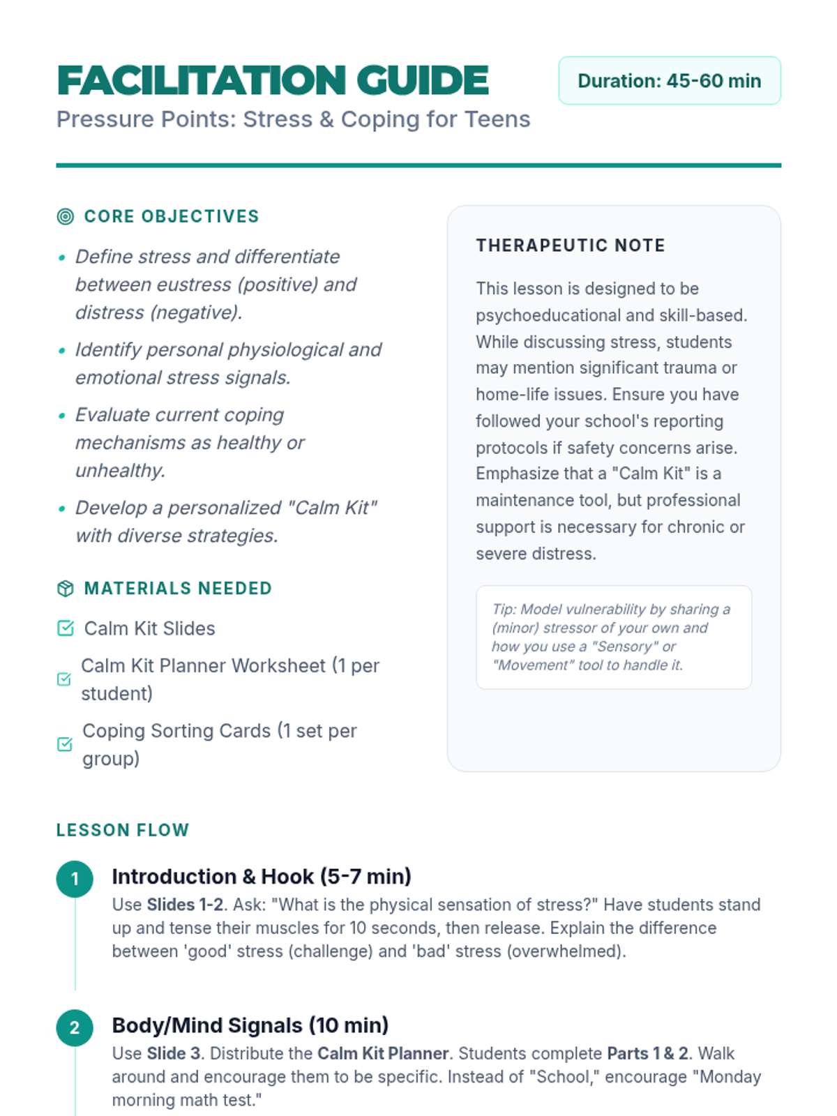 A comprehensive lesson for middle or high school students focused on identifying stress triggers, distinguishing between healthy and unhealthy coping mechanisms, and building a personalized 'Coping Toolkit' for emotional regulation.