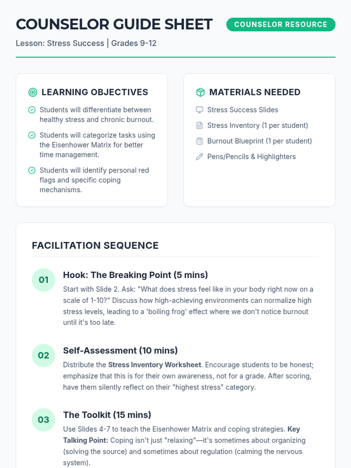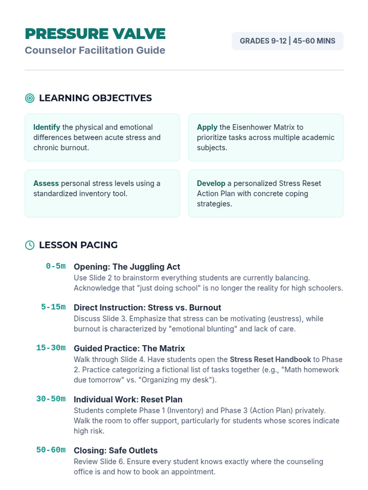 A comprehensive high school counseling lesson designed to help students identify academic stressors, recognize signs of burnout, and implement practical time management and coping strategies for a balanced life.
