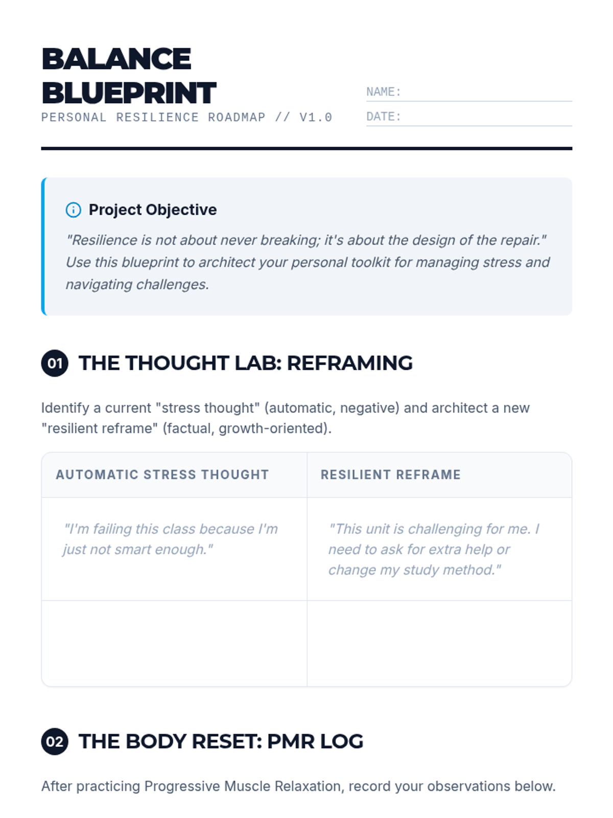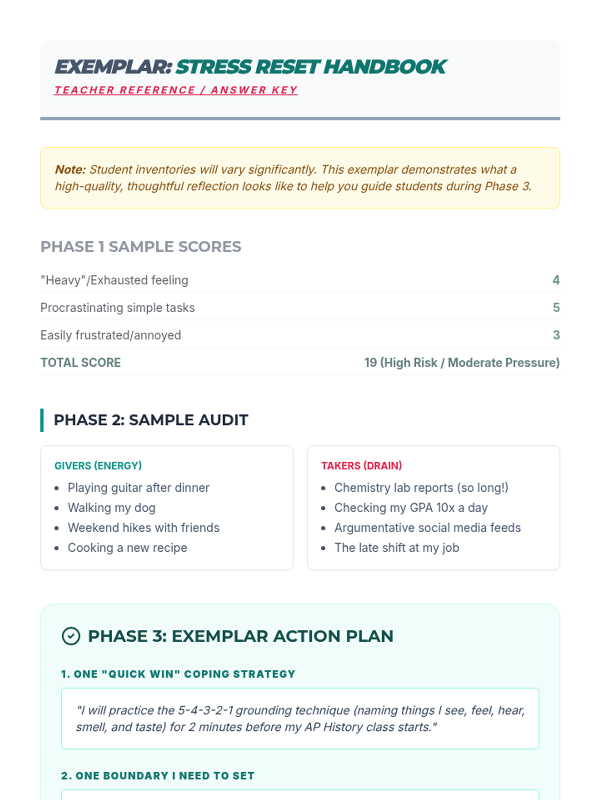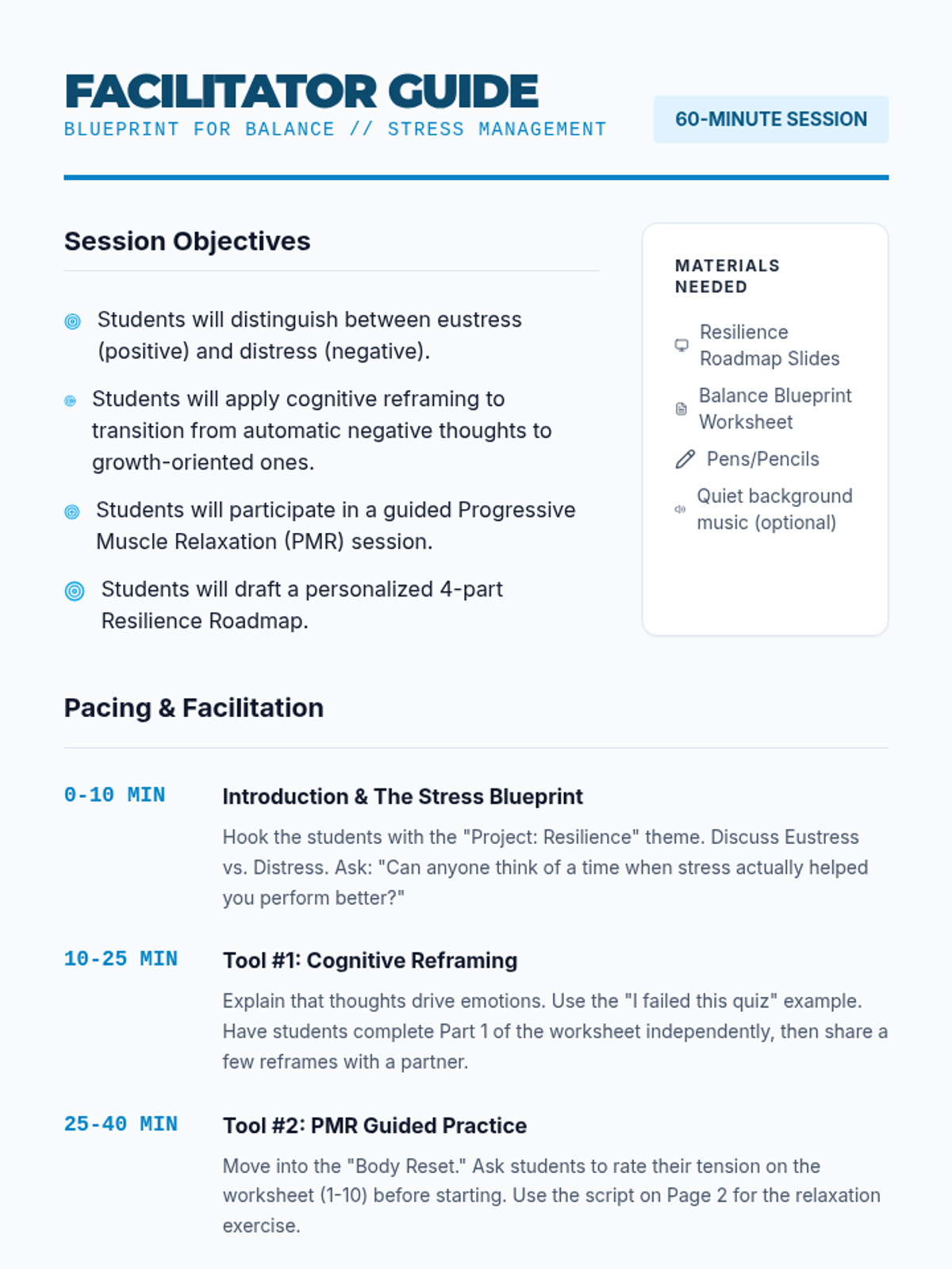 A comprehensive high school counseling lesson designed to equip students with practical tools for managing stress and building long-term resilience through cognitive reframing, physical relaxation techniques, and personalized planning.
