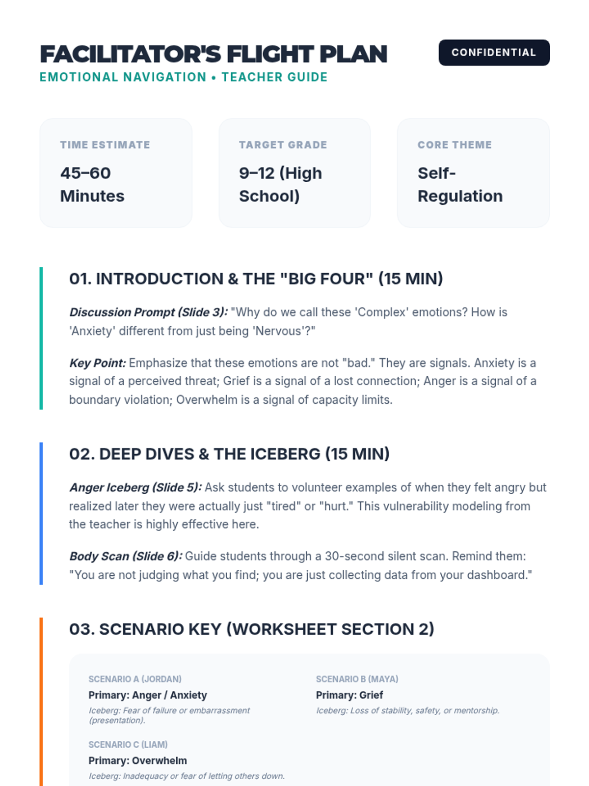 A high school lesson focused on identifying, understanding, and managing complex emotional states like anxiety, grief, anger, and overwhelm. Students explore physiological cues and build a personalized coping toolkit.