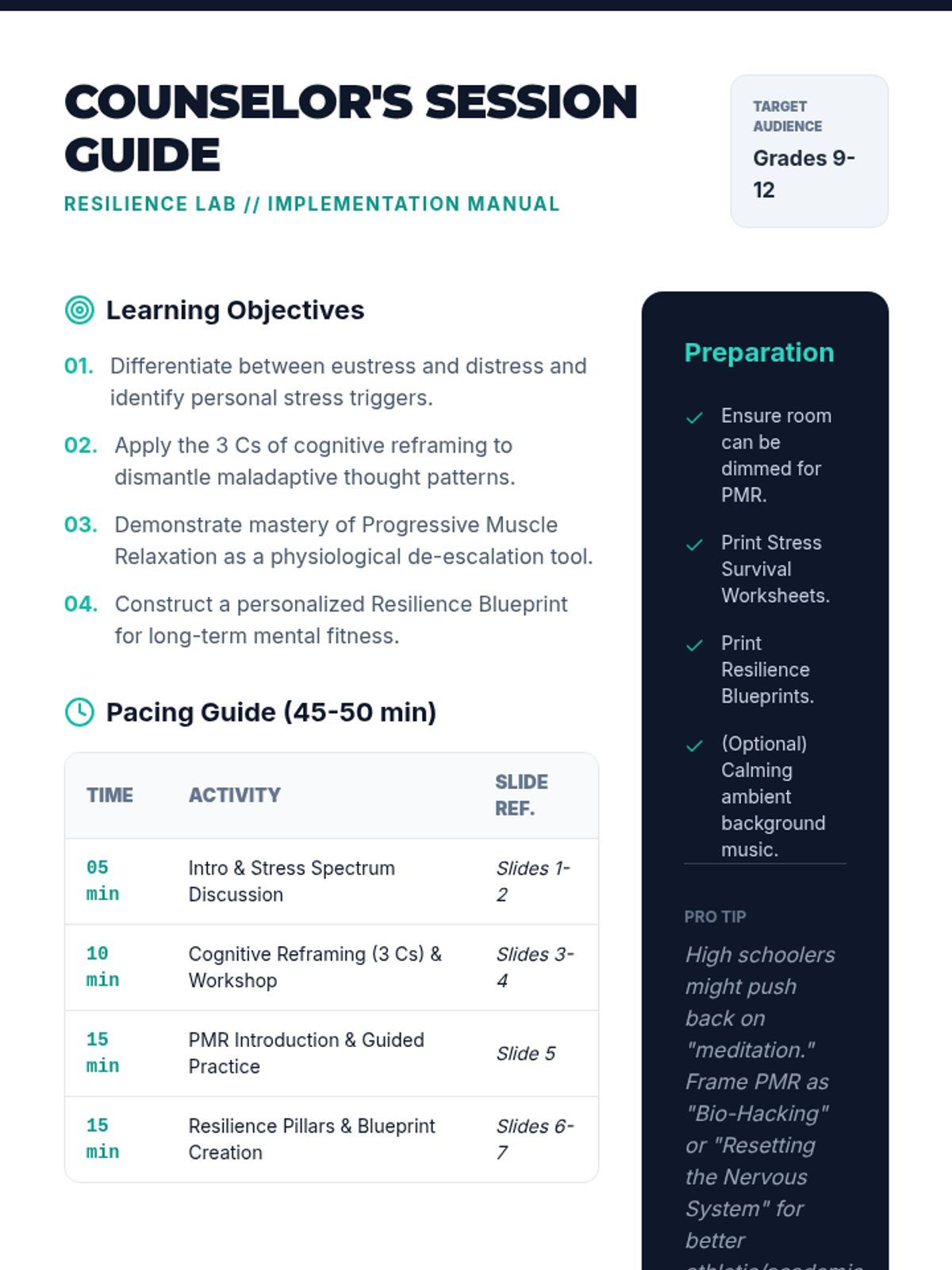 A comprehensive high school counseling session focused on equipping students with practical tools for stress management, including cognitive reframing techniques, progressive muscle relaxation, and the creation of a personalized resilience plan.