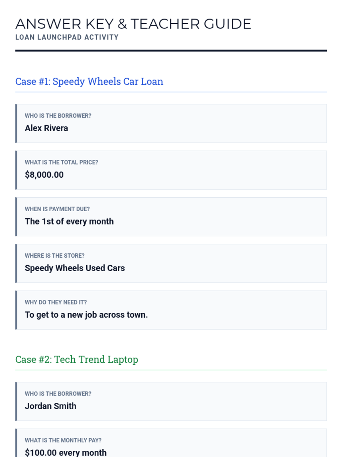 A practical literacy lesson designed for high school students with special needs to master reading and understanding basic loan agreements. Students analyze simplified car and laptop financing documents using a 5W (Who, What, When, Where, Why) framework.