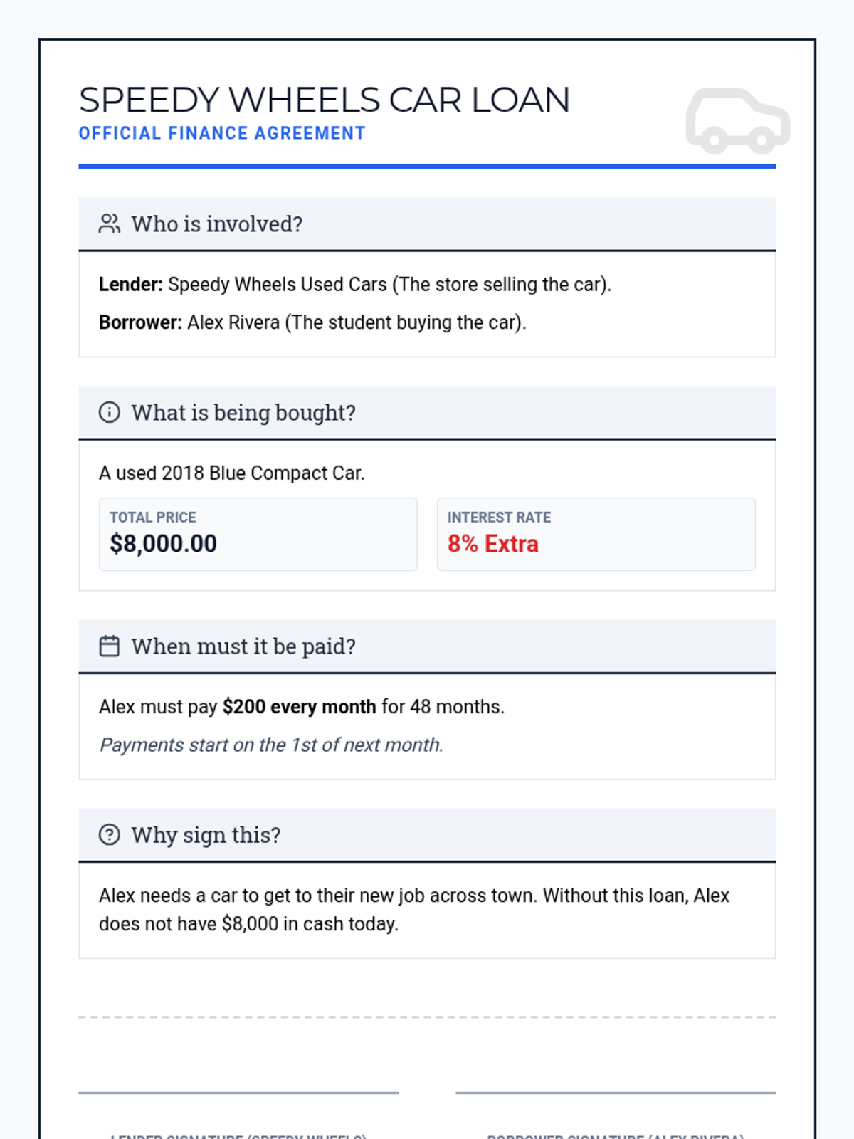 A practical lesson on navigating the complexities of car loans, focusing on interest rates, loan terms, and total cost of ownership. Students will learn to distinguish between monthly payments and the long-term cost of financing a vehicle.