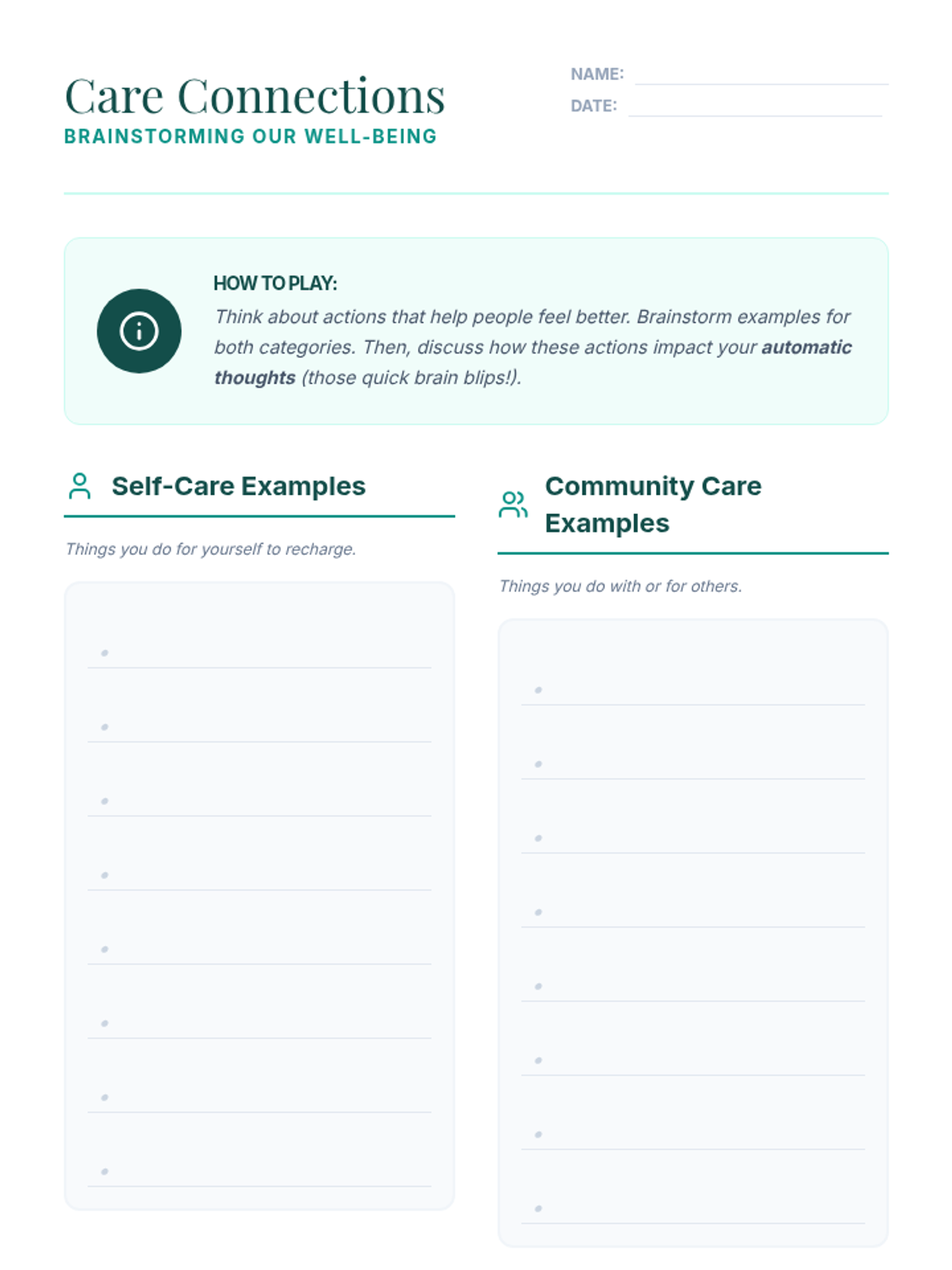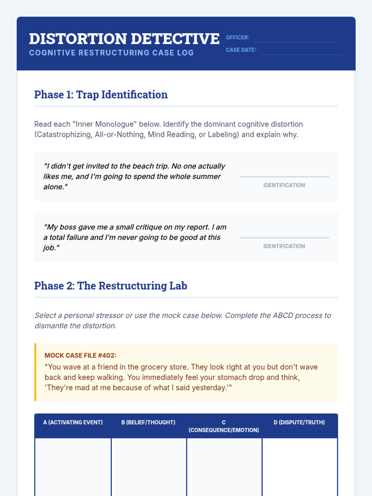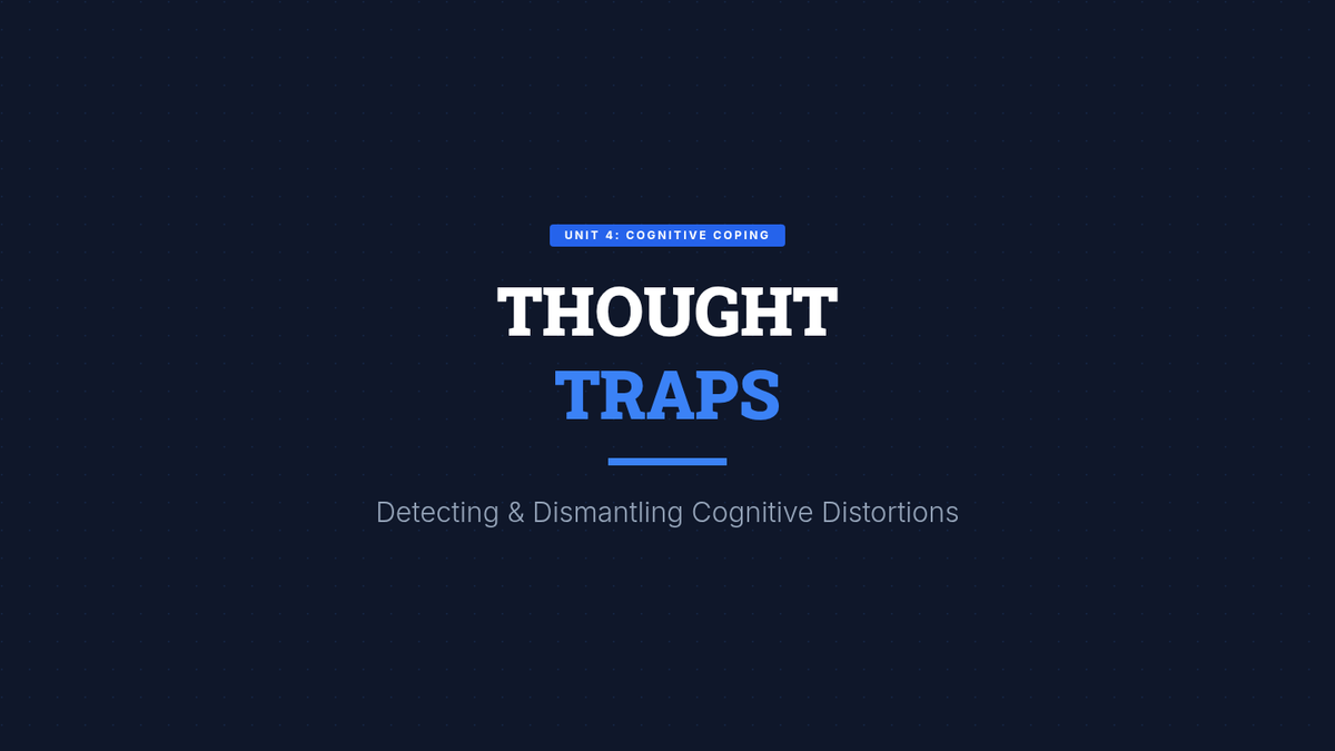 Recognizing Thinking PatternsIdentification of common cognitive distortions such as catastrophizing, overgeneralization, and emotional reasoning. Strengthens metacognitive awareness to disrupt negative internal monologues and promote balanced perspectives.