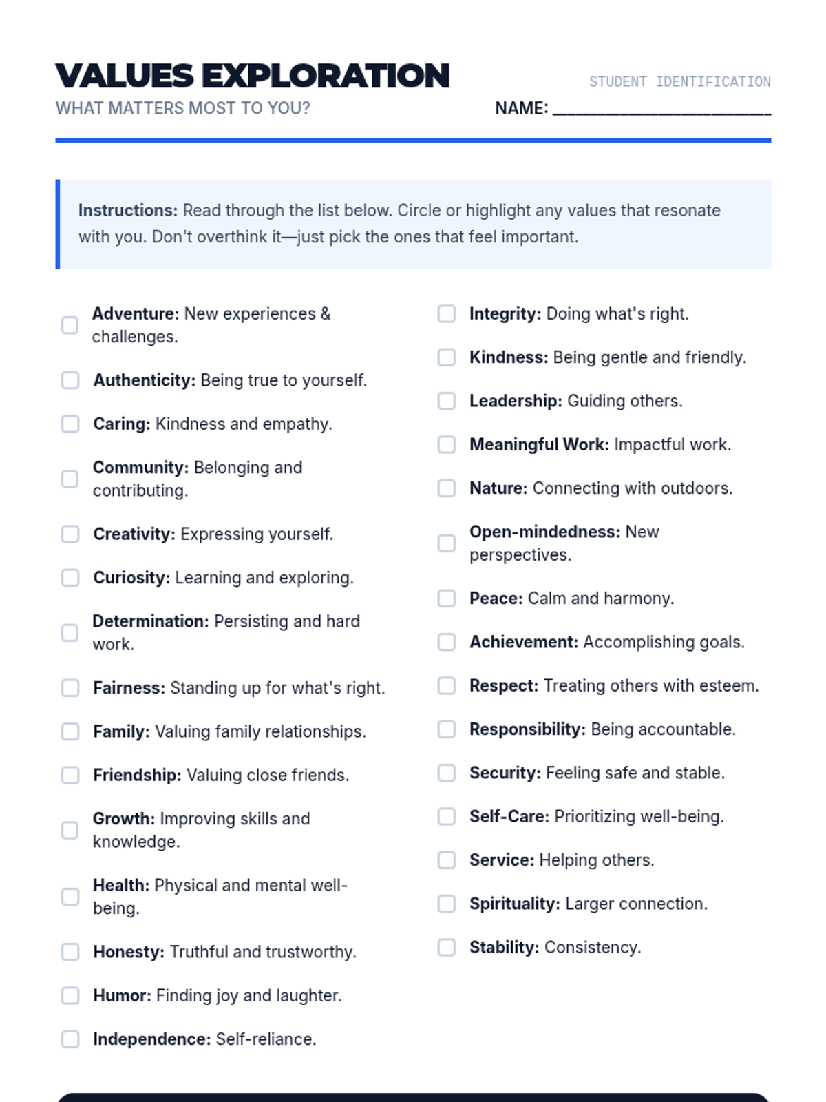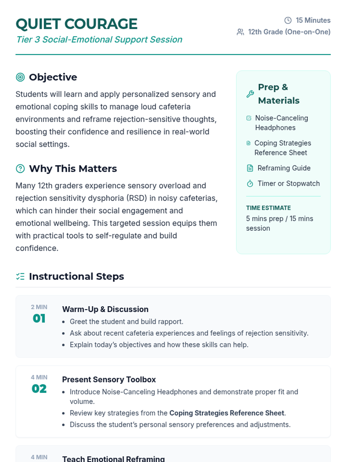 Counseling & Life SkillsSelf-AwarenessBasic Emotion RecognitionComplex Emotion IdentificationEmotional Nuance & Mixed FeelingsBuilding Positive Self-ImageRecognizing Strengths & Growth AreasAccurate Self-AssessmentPersonal Values IdentificationCultural & Individual Identity ExplorationValues-Based Decision MakingSelf-ManagementStop-and-Think StrategiesDelaying GratificationIndependent Impulse ManagementIdentifying Stress TriggersShort-Term Goal SettingSMART Goals DevelopmentGoal Monitoring & AdjustmentBuilding Perseverance & ResilienceInternal Motivation DevelopmentComprehensive Stress Reduction PlanningSocial AwarenessRecognizing Others' FeelingsDemonstrating EmpathyRespecting Individual DifferencesUnderstanding Cultural DiversityComplex Empathetic ResponsesMultiple Viewpoint ConsiderationMulti-Perspective AnalysisChallenging Stereotypes & BiasRelationship SkillsActive ListeningClear Verbal & Nonverbal CommunicationBuilding Positive FriendshipsWorking Cooperatively in GroupsCommunicating Personal BoundariesRespecting Others' BoundariesAssertive ExpressionPeaceful Problem-SolvingContributing to Team GoalsComplex Conflict NavigationMediation & NegotiationHealthy Romantic RelationshipsResponsible Decision-MakingDaily Problem IdentificationBrainstorming Multiple SolutionsEvaluating Pros & ConsRecognizing Risks & ConsequencesApplying Ethical FrameworksInformed Risk-Benefit DecisionsRoot Cause AnalysisMindfulnessMindful BreathingBody Scan MeditationDaily Mindfulness ApplicationDaily Self-Care RoutinesBalancing Life DemandsAdvocating for Wellness NeedsMental Health SupportUnderstanding Anxiety SymptomsWorry Management StrategiesProgressive Muscle RelaxationRecognizing Depression SignsBuilding Mood-Supporting RoutinesBehavioral Activation for MoodUnderstanding Grief StagesHealthy Grief CopingCreative Expression of LossBehavioral SupportDaily Check-In ProceduresDaily Goal Setting & ReviewRecognizing Escalation Warning SignsRequesting Breaks & SupportSelf-Calming During DistressUnderstanding Positive ReinforcementToken Economy ImplementationBehavior Chart TrackingAnalyzing Behavior PatternsIdentifying Antecedents & ConsequencesDetermining Behavior FunctionFunction-Based InterventionsIndividualized Behavior ContractsData-Driven Behavior AdjustmentTherapeutic ApproachesThoughts-Feelings-Behaviors ConnectionRecognizing Thinking PatternsChallenging Negative ThoughtsPositive Self-Talk PracticeThought Record TrackingAdvanced Cognitive RestructuringComprehensive CBT PlansBehavioral Activation TechniquesBuilding Positive ExperiencesExposure Hierarchies for AnxietyPresent-Moment AwarenessNon-Judgmental ObservationSelf-Soothing & DistractionComplex Emotion LabelingReducing Emotional Vulnerability (PLEASE)DEAR MAN CommunicationGIVE Skills for RelationshipsFAST Skills for Self-RespectRadical Acceptance PracticeCrisis Survival Skills (TIPP)Understanding Trauma EffectsTrauma Responses & TriggersIdentifying Trauma FeelingsGrounding TechniquesRegulation During Trauma DistressSafe Place VisualizationProcessing Through NarrativeDeveloping Trauma StoryPersonalized Safety PlanningGroup SupportTurn-Taking & SharingGroup Conversation SkillsSharing in Supportive EnvironmentLearning from Similar ChallengesBuilding Community & BelongingNavigating Peer RelationshipsGroup Skill PracticeGroup Mental Health EducationStress & Anxiety UnderstandingCrisis Support & SafetyKnowing When to Seek HelpIdentifying Mental Health CrisesGrounding During CrisisUsing Crisis HotlinesBuilding Support NetworksAccessing Mental Health ResourcesWarning Signs & Coping StrategiesDeveloping Personal Safety PlansUnderstanding Suicide Warning SignsGatekeeper Skills for PeersDigital LiteracySocial MediaTechnology BasicsProductivity ToolsInternet and Online ResearchWeb Design and PublishingDigital CitizenshipOnline Safety and PrivacyEmerging TechnologiesFinancial LiteracyMaking Financial DecisionsBanking and AccountsConsumer SkillsSaving and InvestingCredit and DebtEmployment and IncomeTaxesInsuranceMajor PurchasesEconomic ConceptsFinancial PlanningCollege & Post-Secondary PlanningCareer ExplorationUnderstanding Post-Secondary OptionsCollege Research & SelectionAdmission RequirementsCollege Application ProcessPersonal Statement WritingFAFSA CompletionScholarship Search & ApplicationsUnderstanding Student LoansContinuing Education PlanningInterview PreparationResearching EmployersCommon Interview QuestionsSTAR Method ResponsesProfessional Interview PresenceVirtual Interview SkillsInterview Follow-UpJob Search SkillsUnderstanding Job PostingsEffective Job Search StrategiesNetworking for OpportunitiesResume Writing BasicsAction Verbs & AchievementsTailoring Resumes to JobsCover Letter WritingProfessional ReferencesProfessional CommunicationBusiness Email EtiquettePhone & Voicemail ProfessionalismMeeting ParticipationPresentation SkillsProfessional Work EthicTime Management & ProductivityTeamwork & CollaborationAdaptability & FlexibilityProblem-Solving at WorkConstructive FeedbackWorkplace RightsUnderstanding Employment LawsPay & Benefits UnderstandingWorkplace SafetyAnti-Discrimination & Harassment