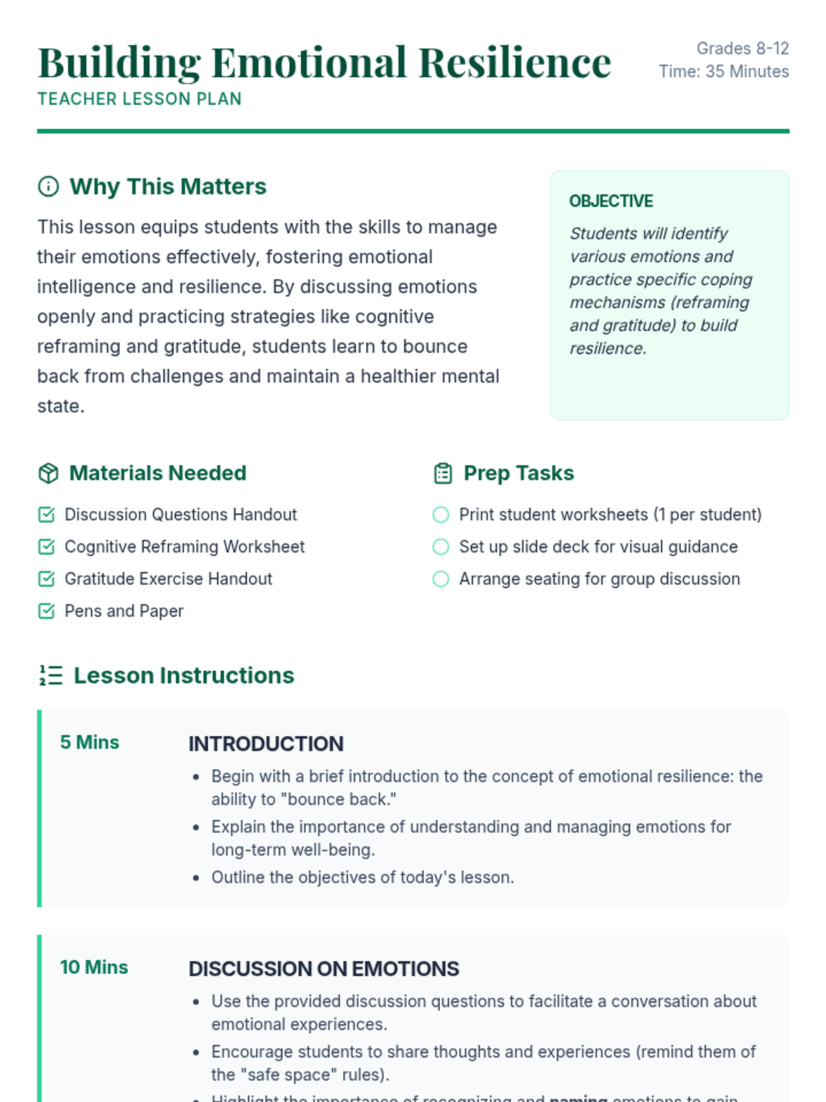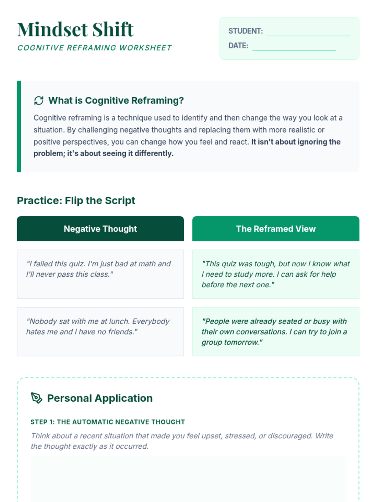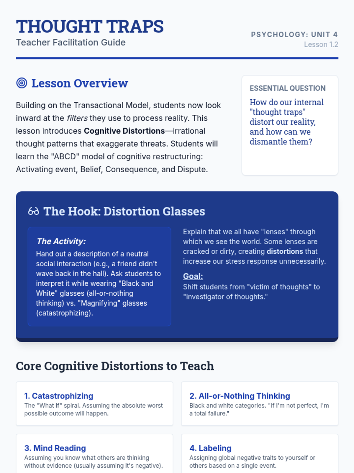 Challenging Negative ThoughtsCognitive restructuring techniques and identification of common cognitive distortions. Equips learners with evidence-based questioning strategies to reframe maladaptive self-talk and promote balanced thinking.