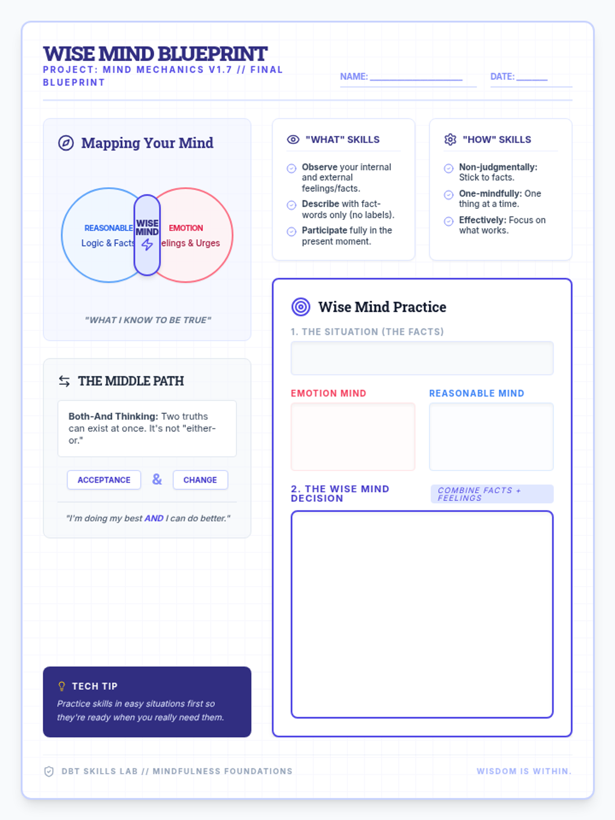 Crisis Survival Skills (TIPP)Physiological strategies for rapid emotional regulation through temperature changes, intense exercise, paced breathing, and paired muscle relaxation. Targets immediate distress reduction and nervous system stabilization during crisis moments.