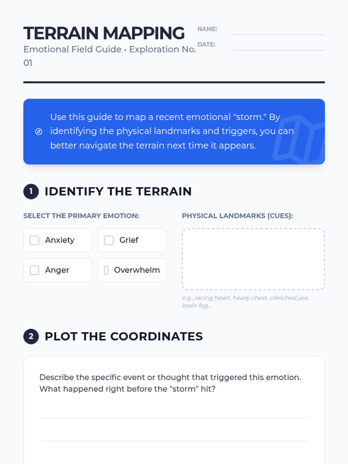 Identifying Trauma FeelingsRecognition of emotional and physiological signatures associated with traumatic experiences. Targets awareness of triggers, somatic markers, and the distinction between past reactions and present safety.
