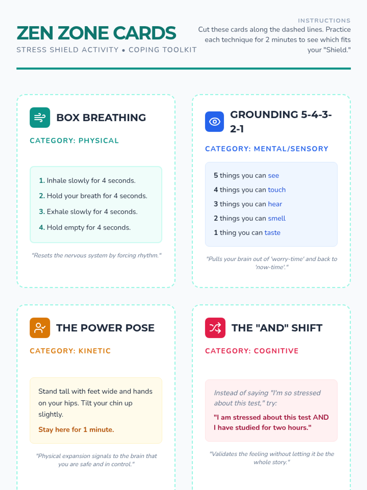 Students compile the physical techniques learned into a quick-reference guide and practice a 'fire drill' simulation to rapidly apply skills during stress triggers.