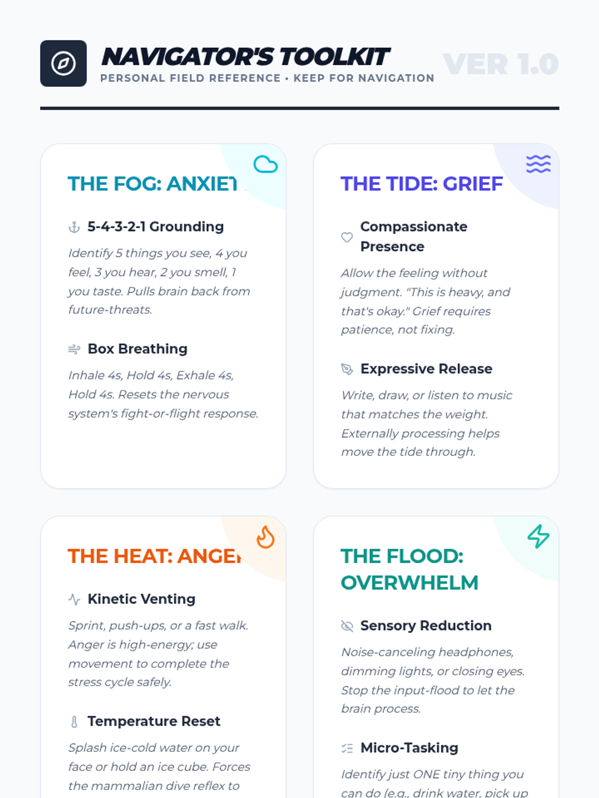Self-Soothing & DistractionSensory-based grounding techniques and distress tolerance strategies for immediate emotional regulation. Equips individuals with mindfulness practices and constructive diversions to manage intense psychological triggers.