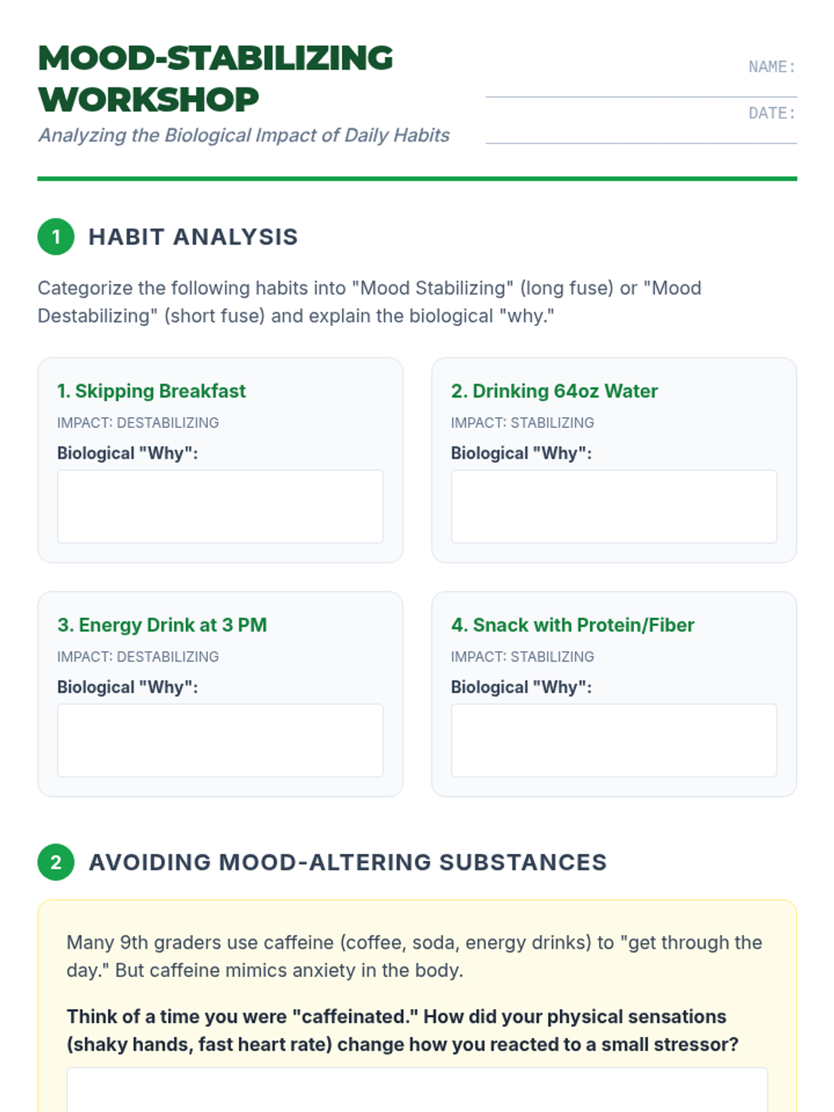 Students analyze the difference between judgmental language and objective facts, practicing how to strip away evaluative adjectives to reduce emotional distress.