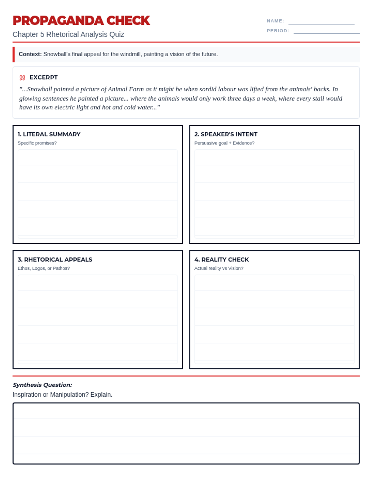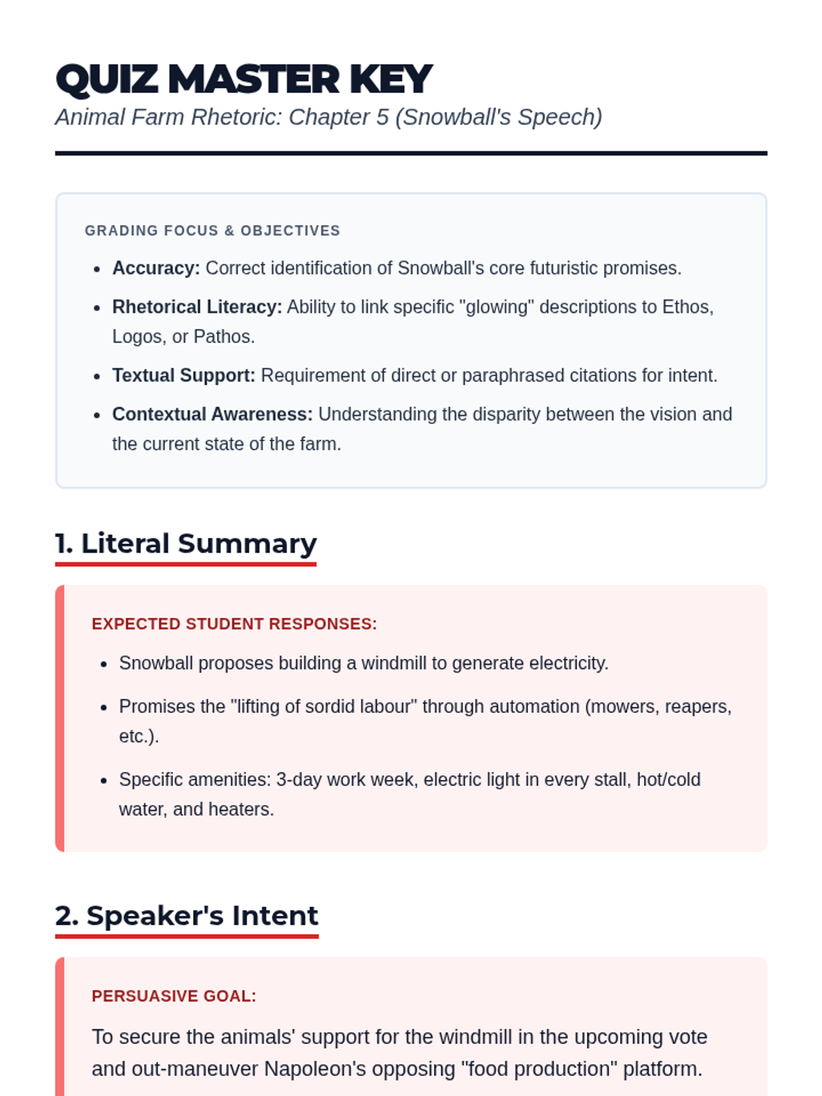 In this lesson, students analyze Snowball's pivotal speech regarding the windmill in Chapter 5 of Animal Farm. They compare his rhetorical strategies to Squealer's previous manipulation and complete a formal rhetorical analysis quiz.