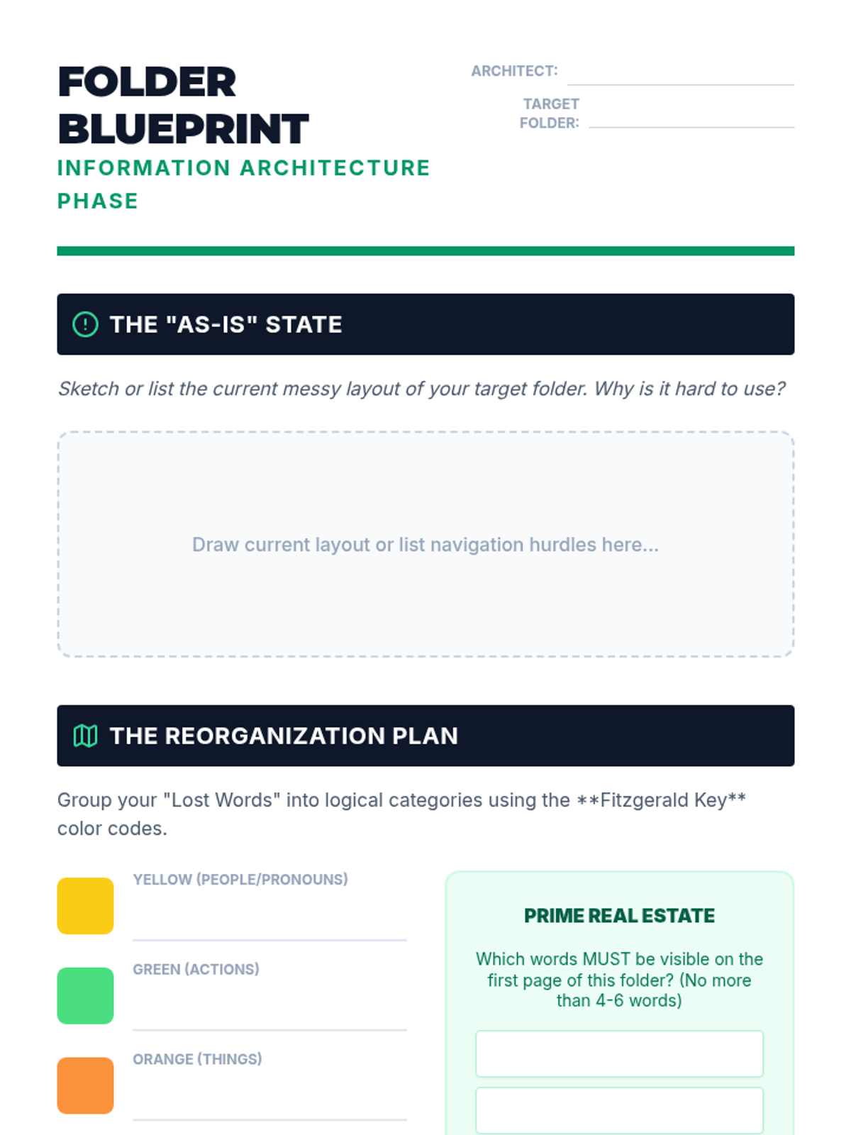 Students learn principles of information architecture, such as color-coding (Fitzgerald Key) and frequency of use, to plan a reorganization of a specific messy folder.