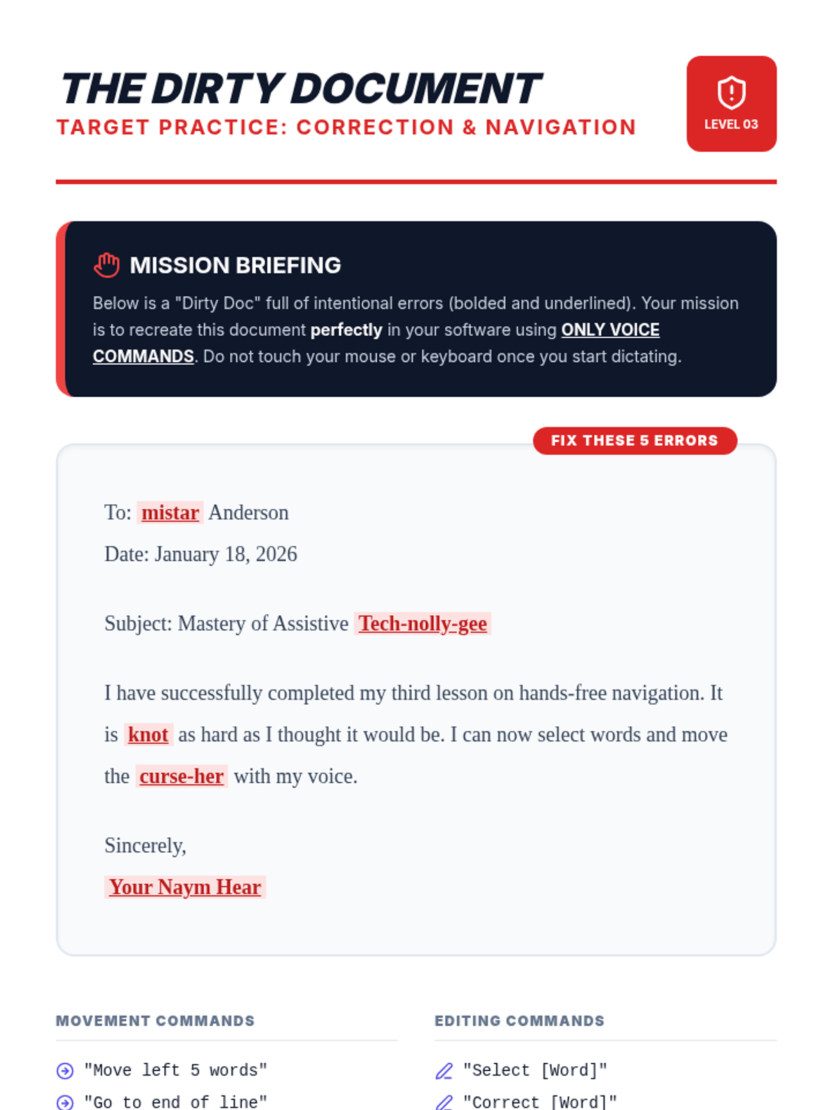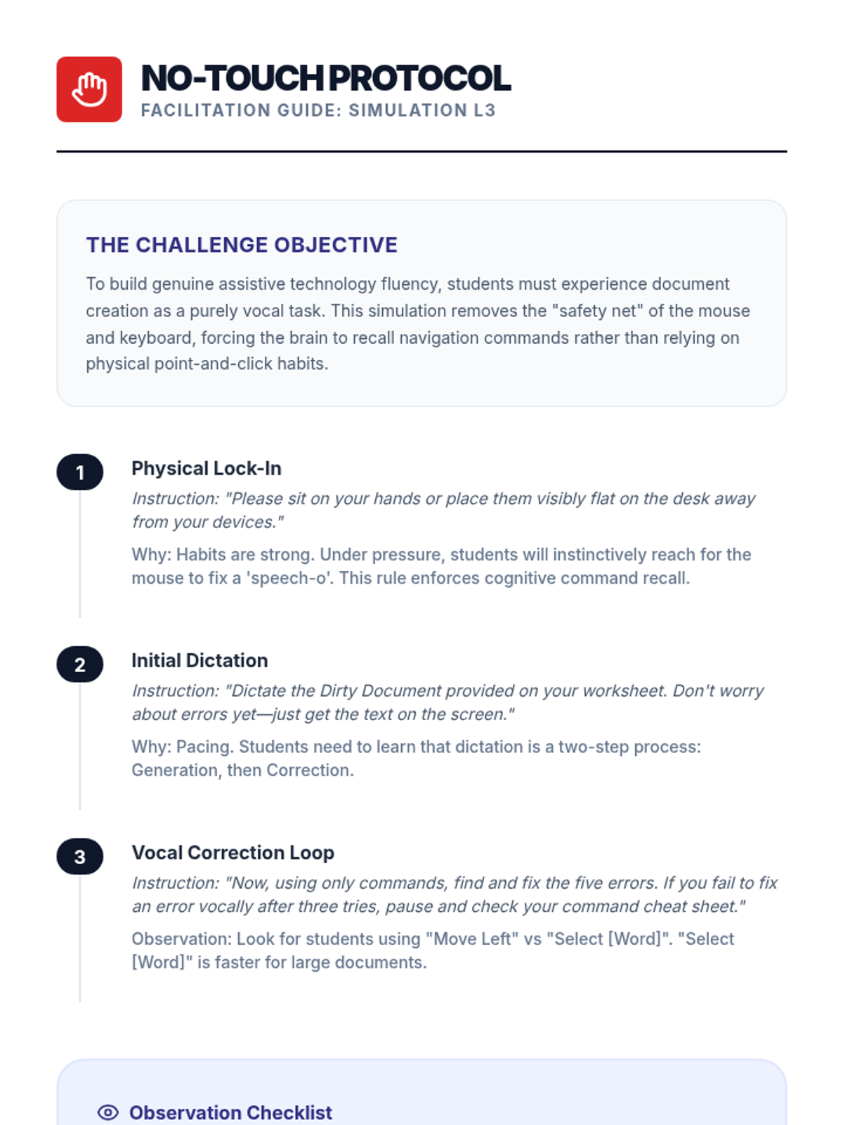 Students learn to edit and navigate documents using only voice commands, practicing the 'No-Touch Challenge' to build assistive technology fluency.