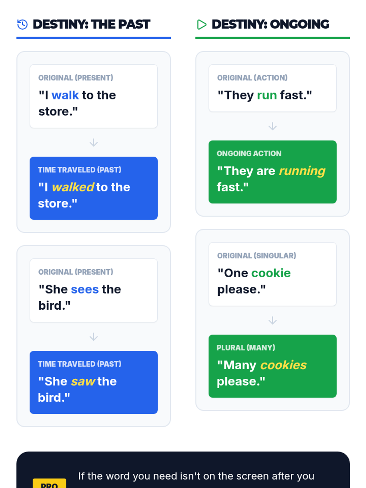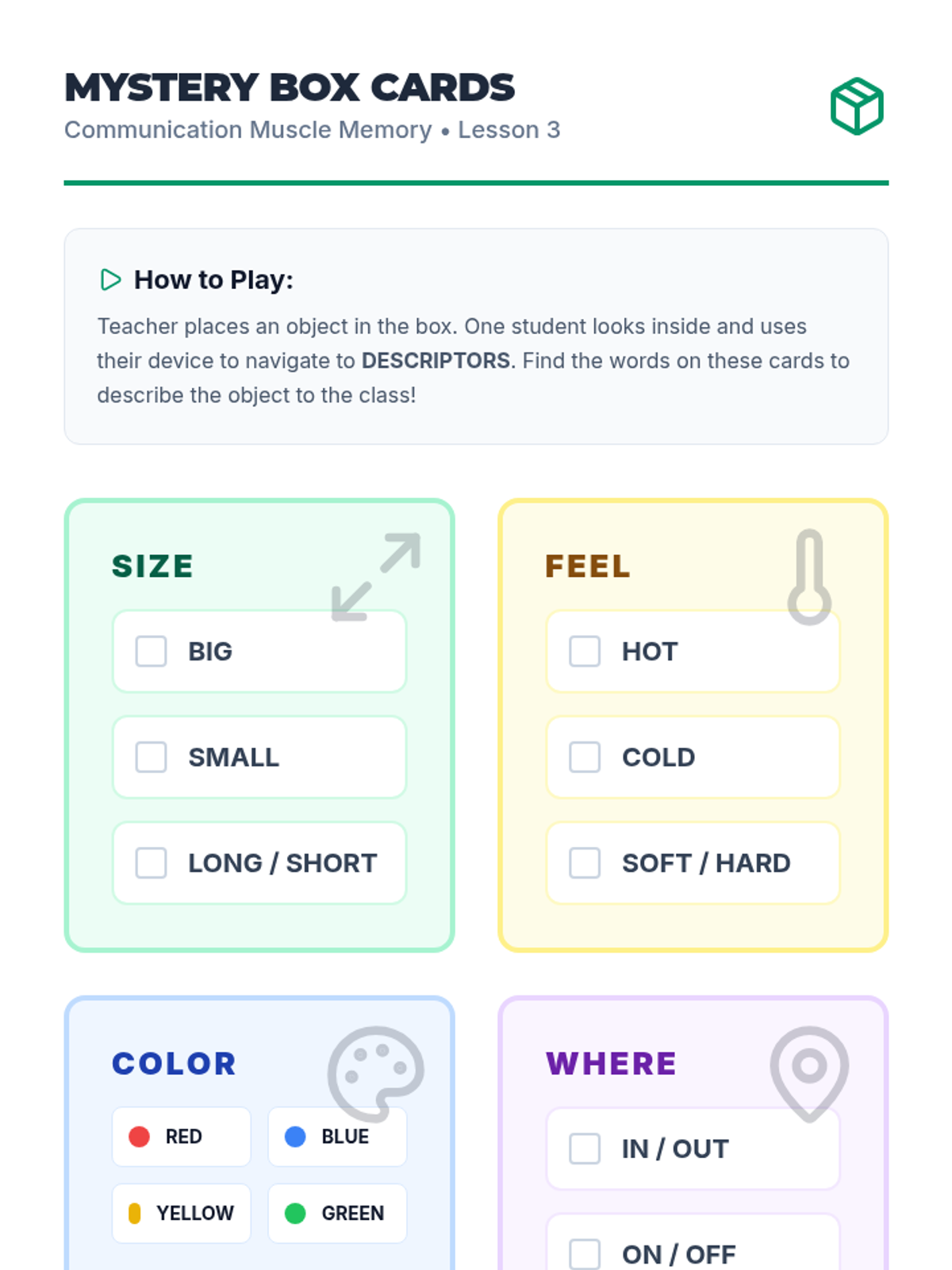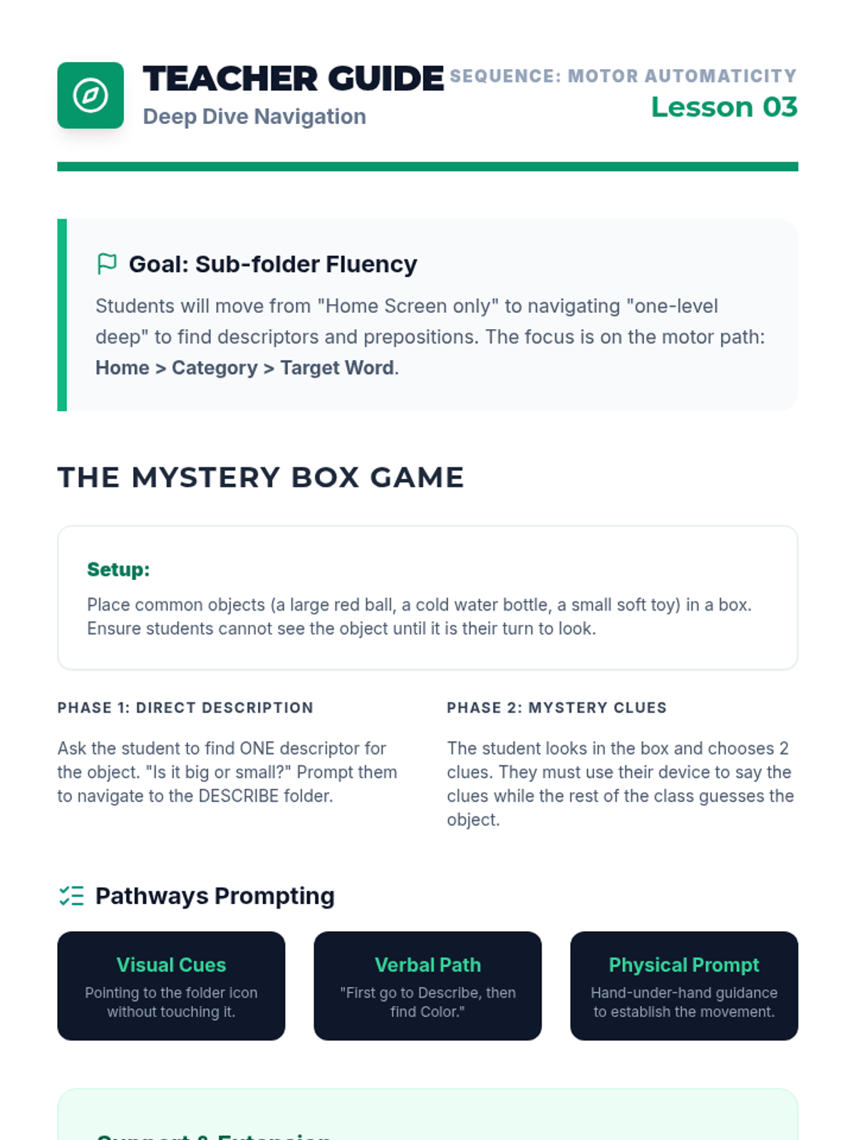 Focuses on navigation pathways for adjectives and prepositions, using descriptors to expand message complexity through gamified interaction.