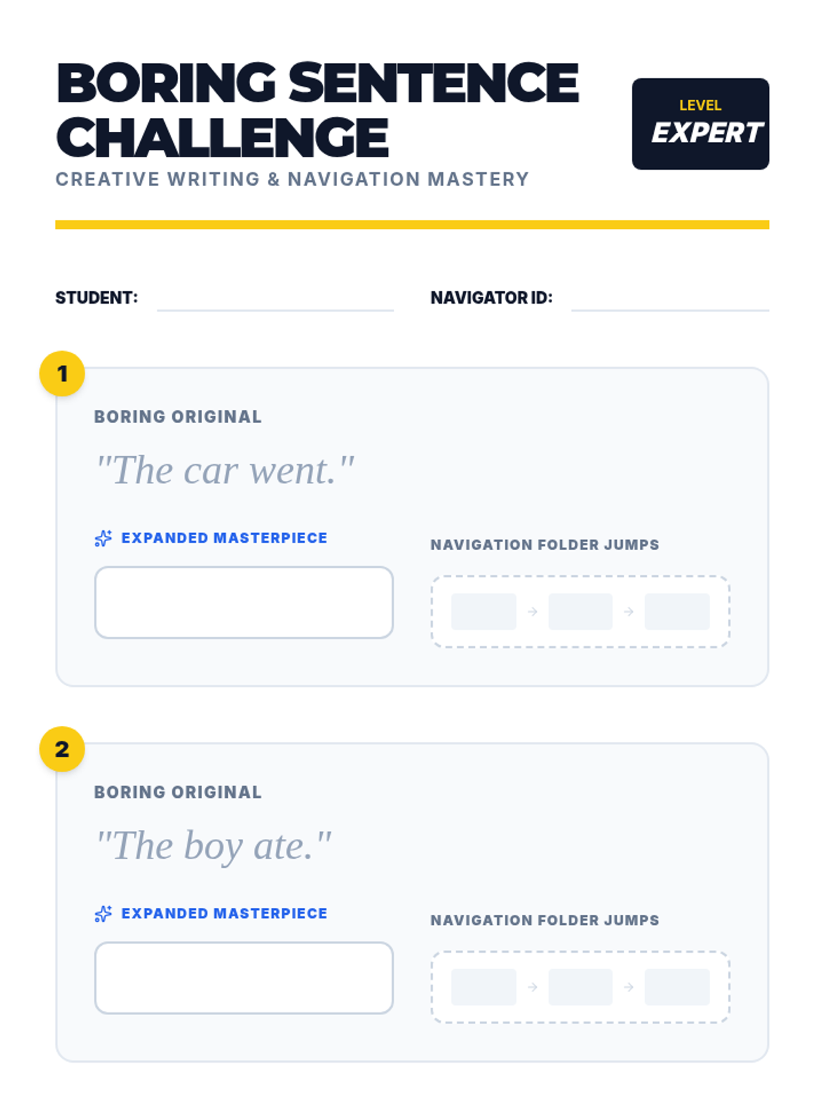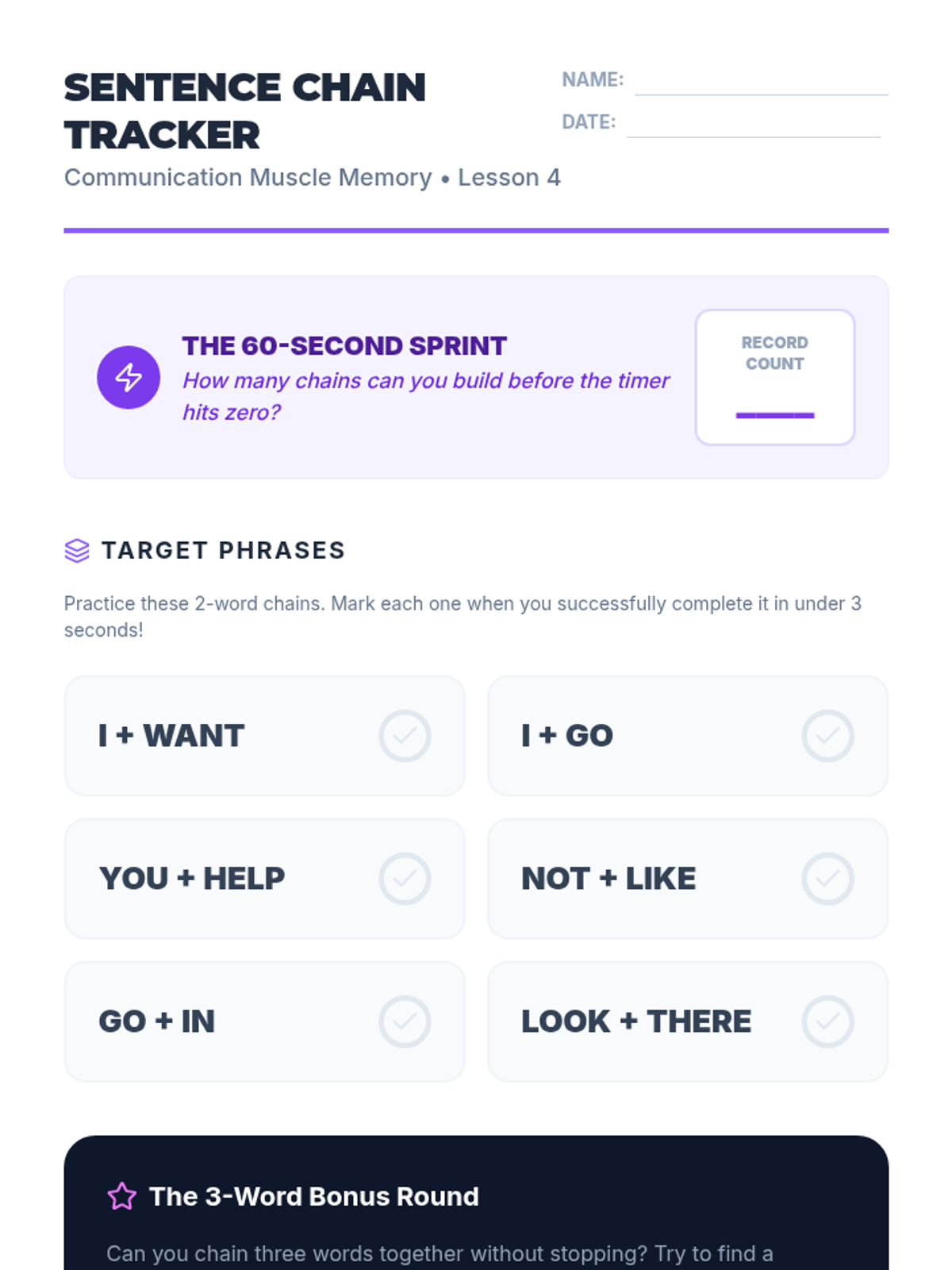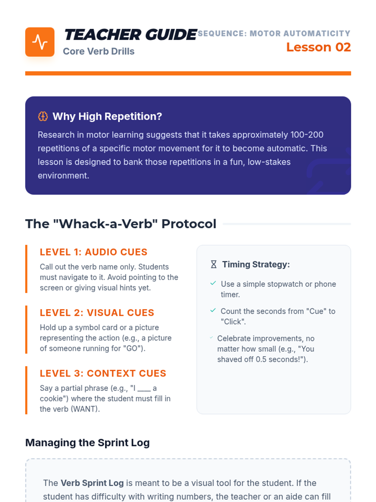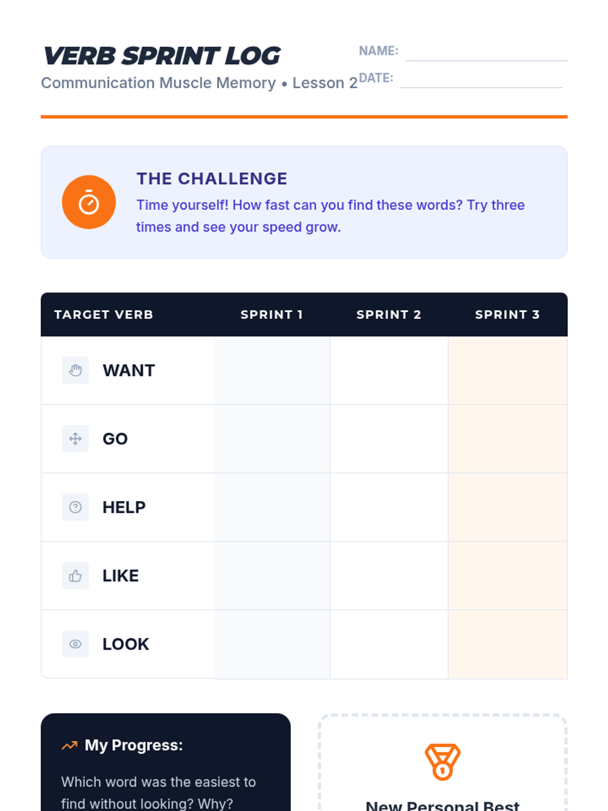 Students participate in high-repetition timed drills to locate common action verbs, transitioning knowledge from short-term memory to motor planning.
