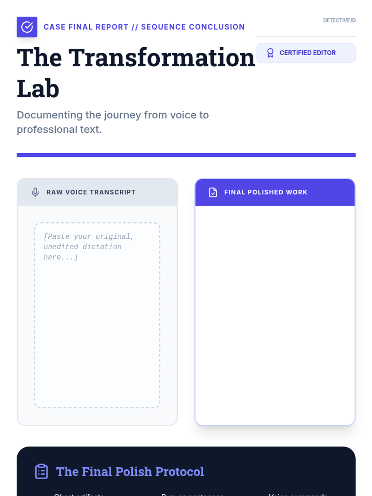Synthesis of all skills into a cohesive proofreading and correction workflow, analyzing 'speech-os' and refining speaking pace for high-stakes writing.
