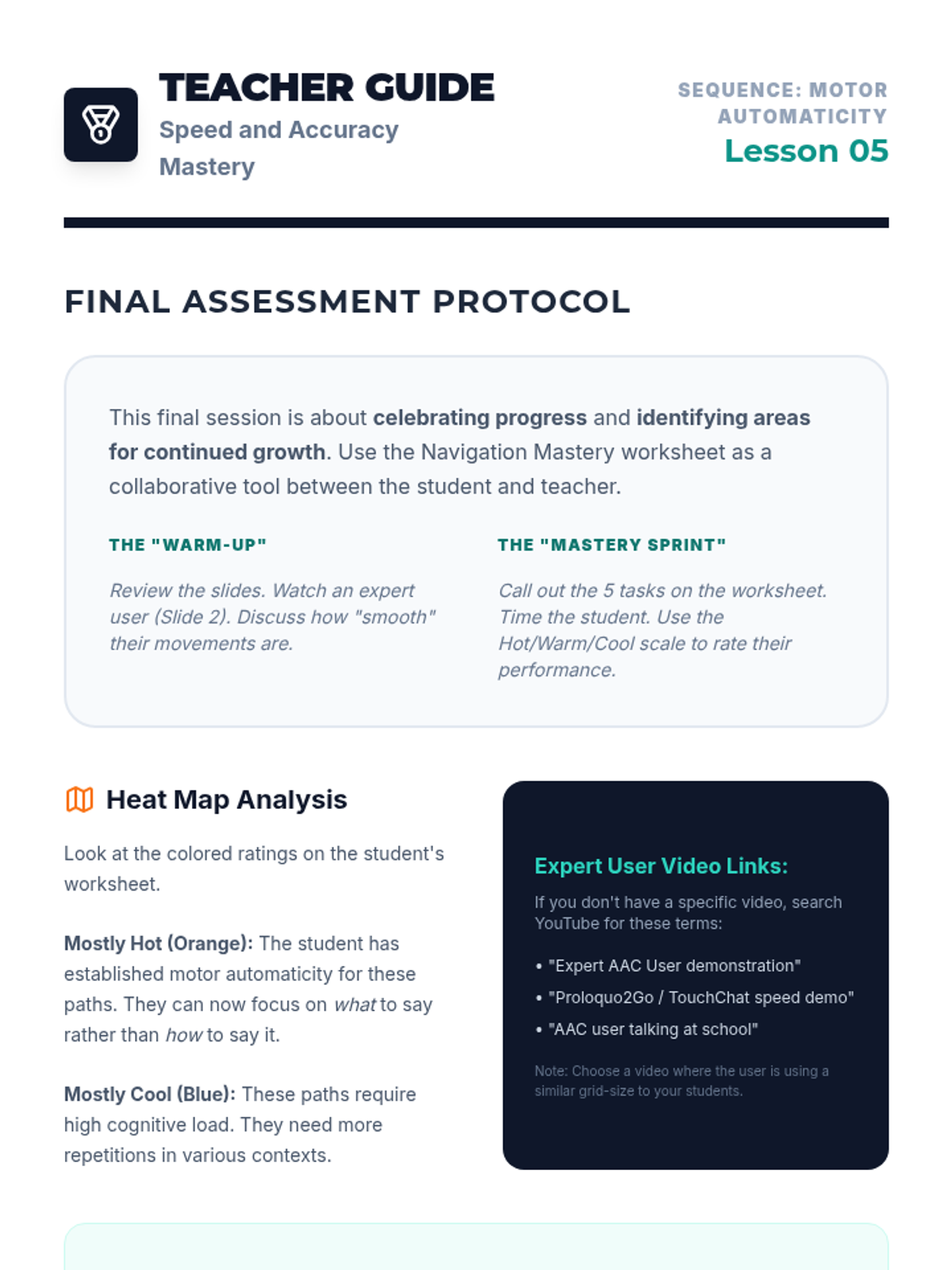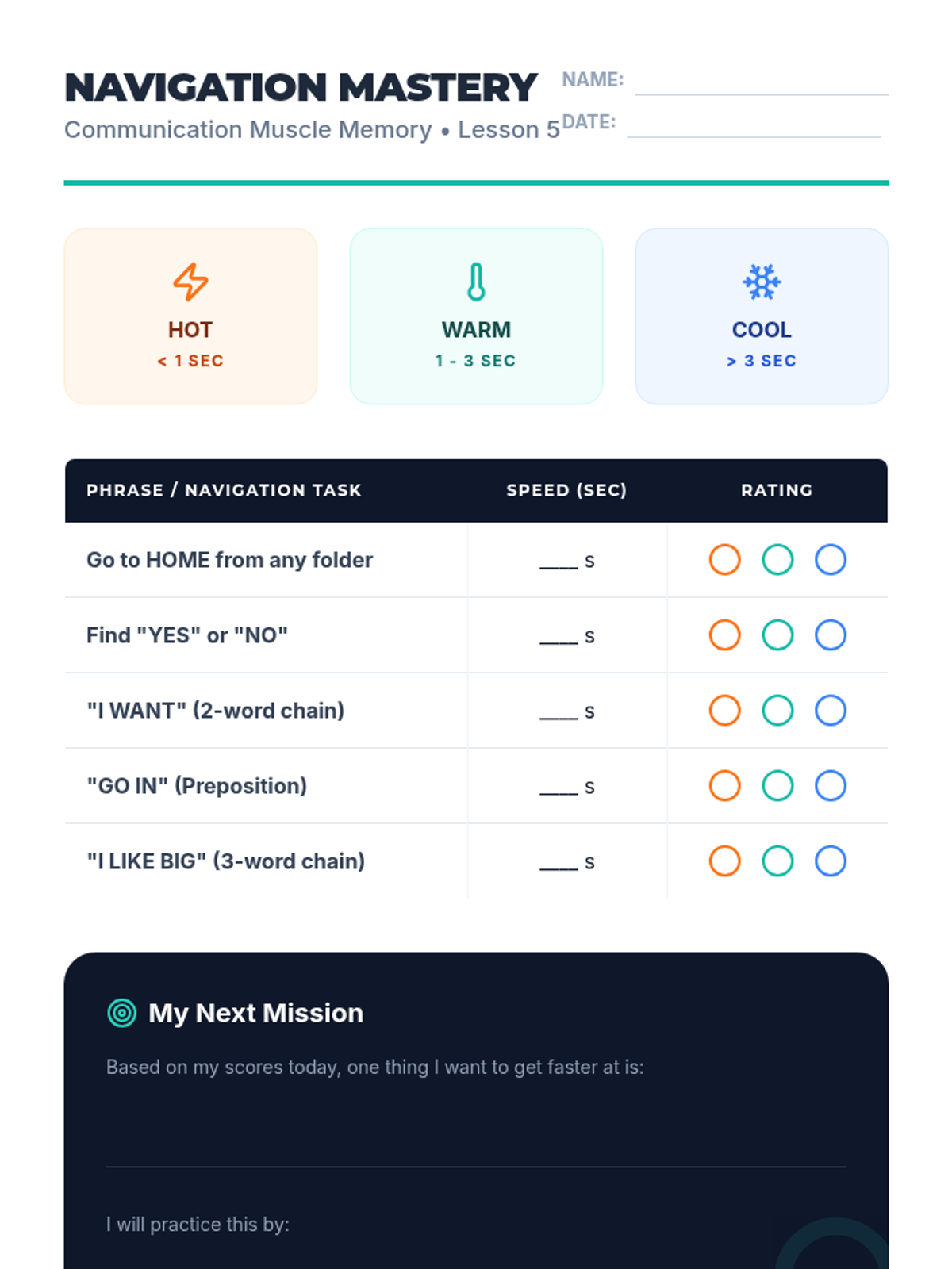 A culminating session where students measure their navigation speed and accuracy, set future goals, and analyze their growth as efficient communicators.
