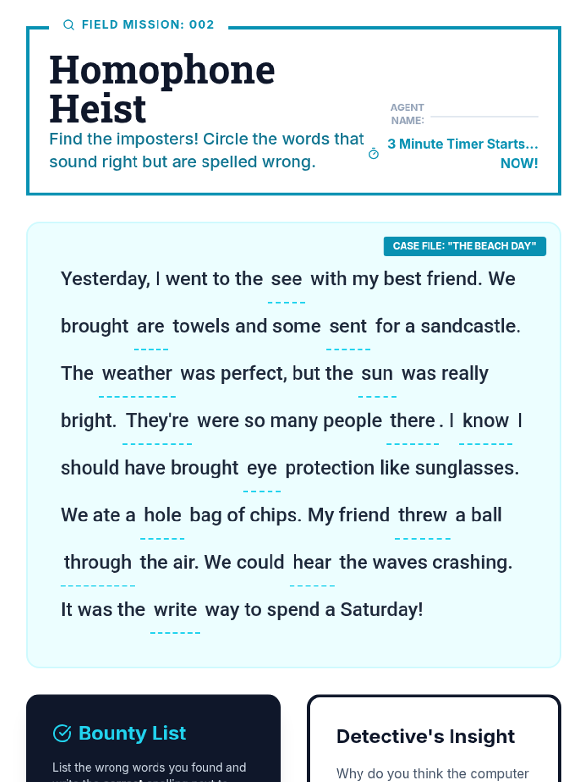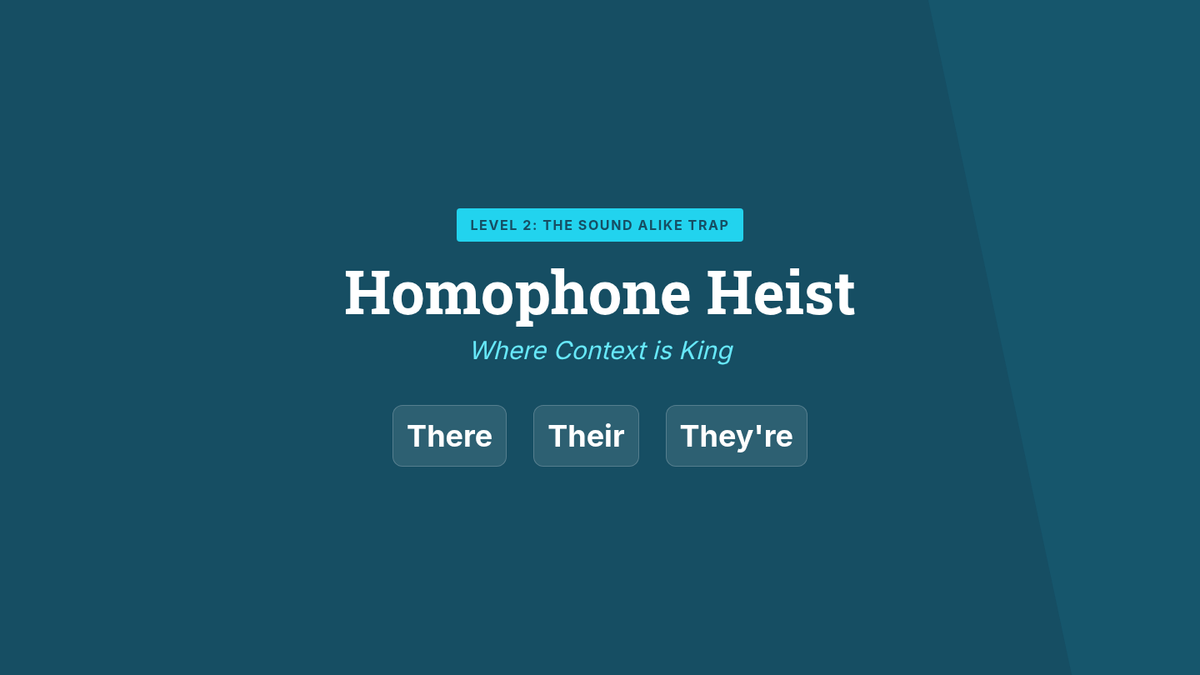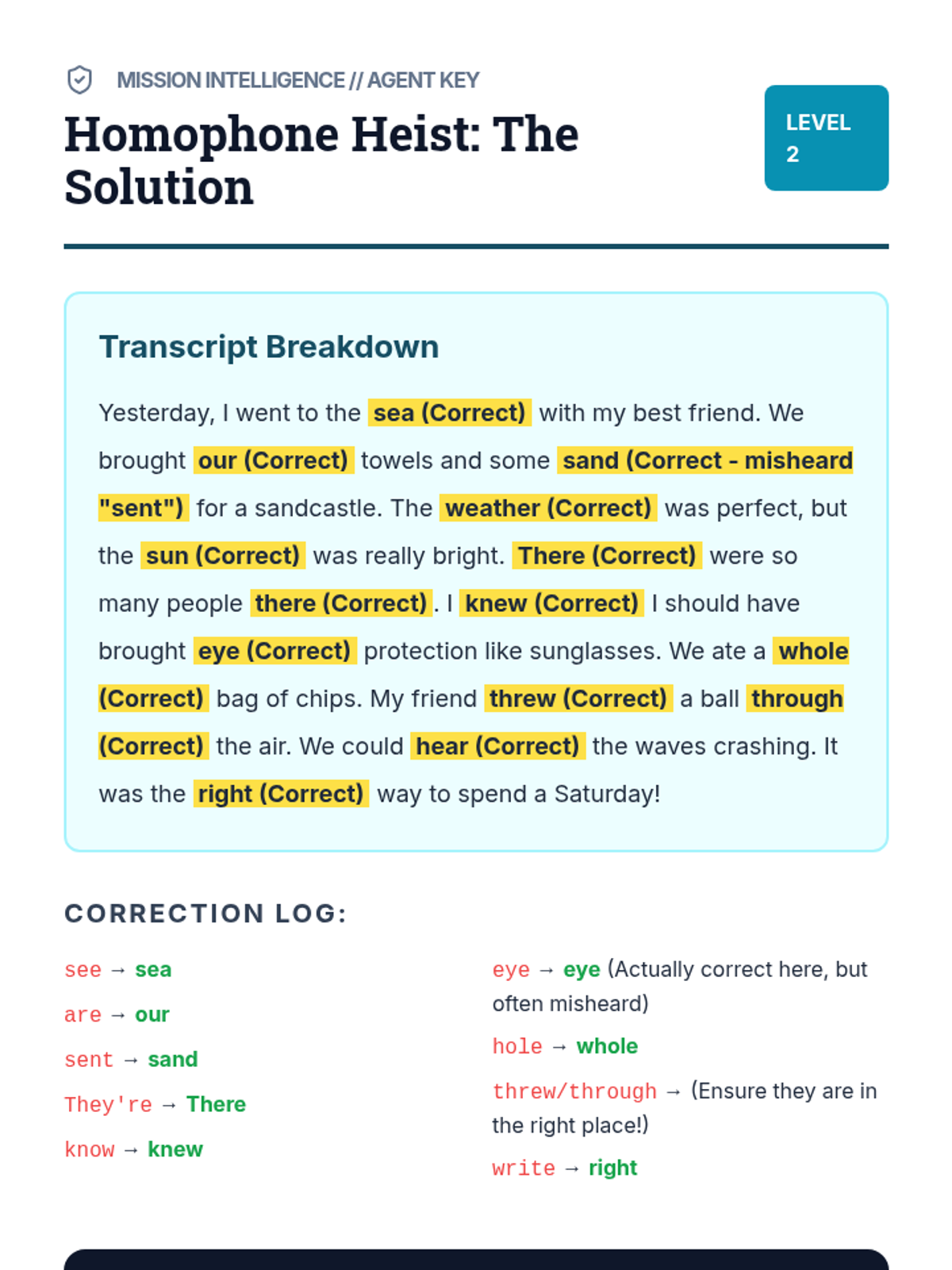 A focused lesson on context-based corrections, specifically targeting homophones that sound the same but are spelled differently, which are frequent pitfalls in dictation.