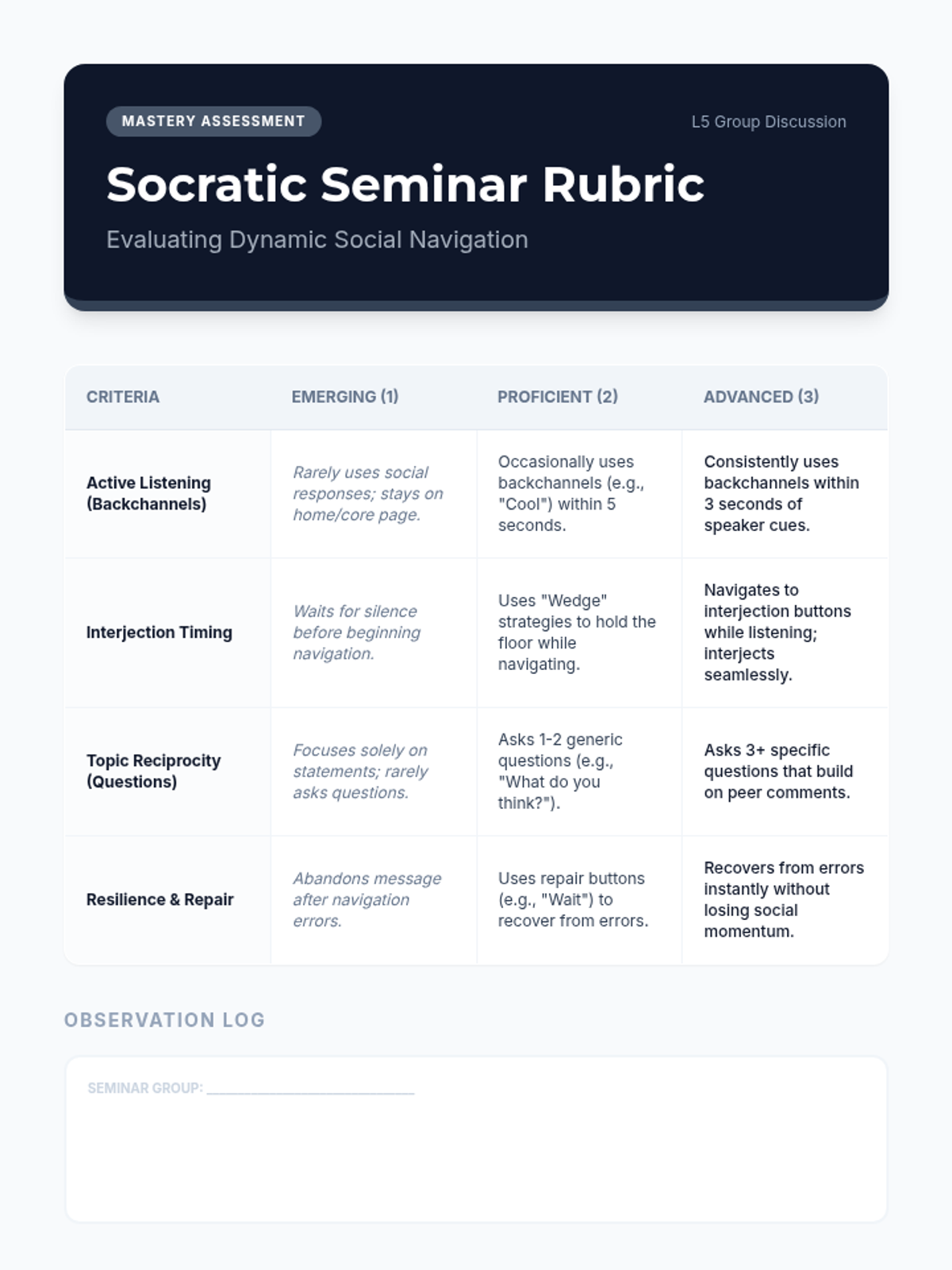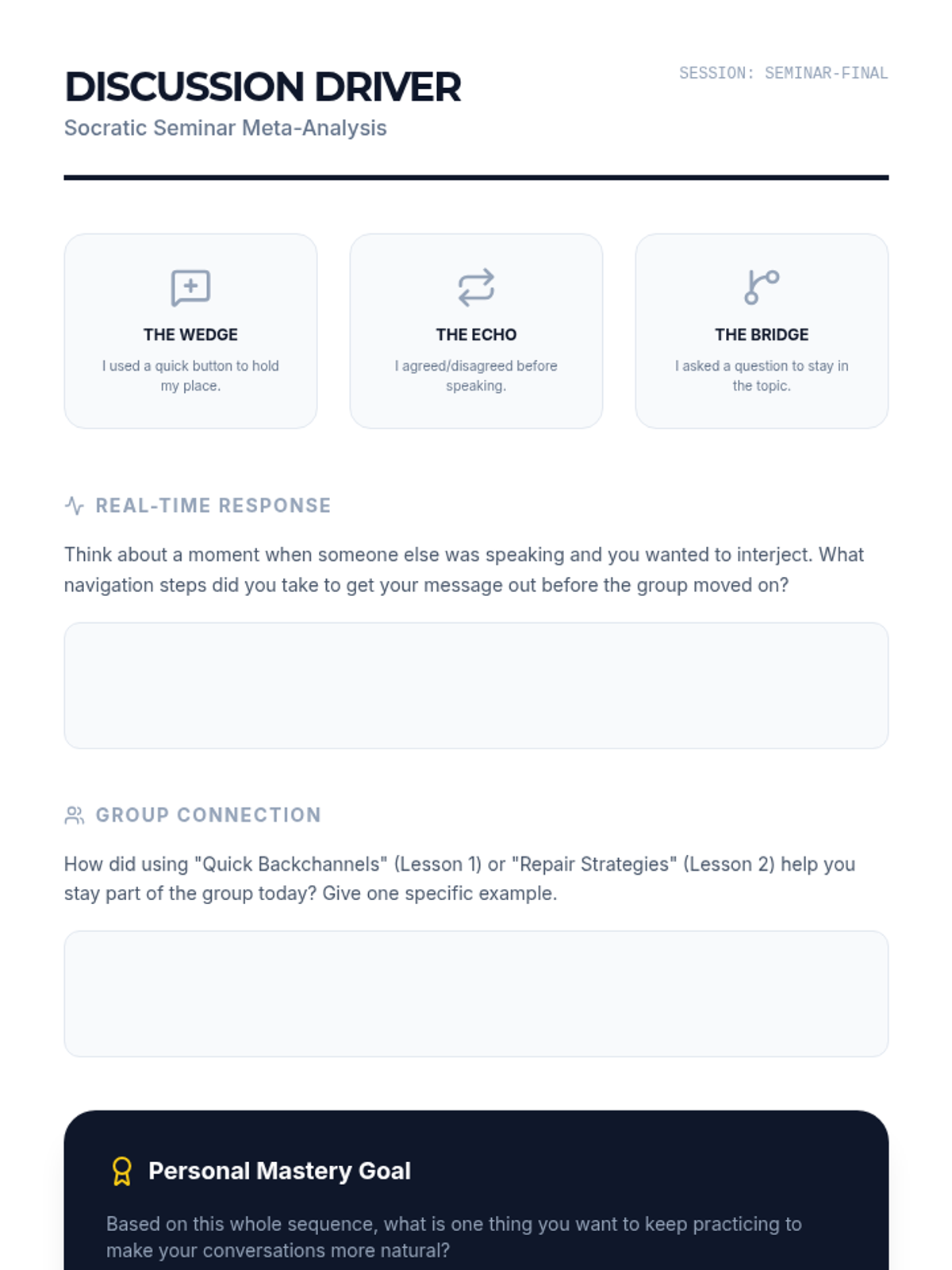 A Socratic seminar where students use their devices to interject, agree, or disagree in real-time, demonstrating mastery of navigation speed.