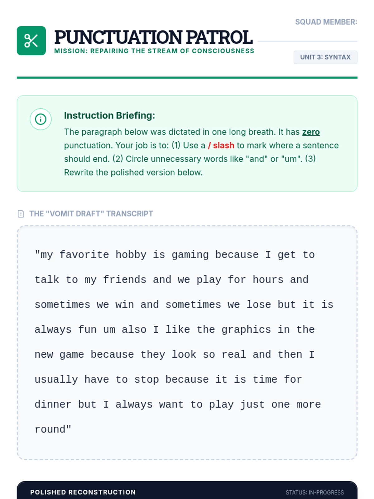 Students learn to transform 'stream of consciousness' dictated text into structured writing by identifying run-on sentences and adding punctuation and transitions.
