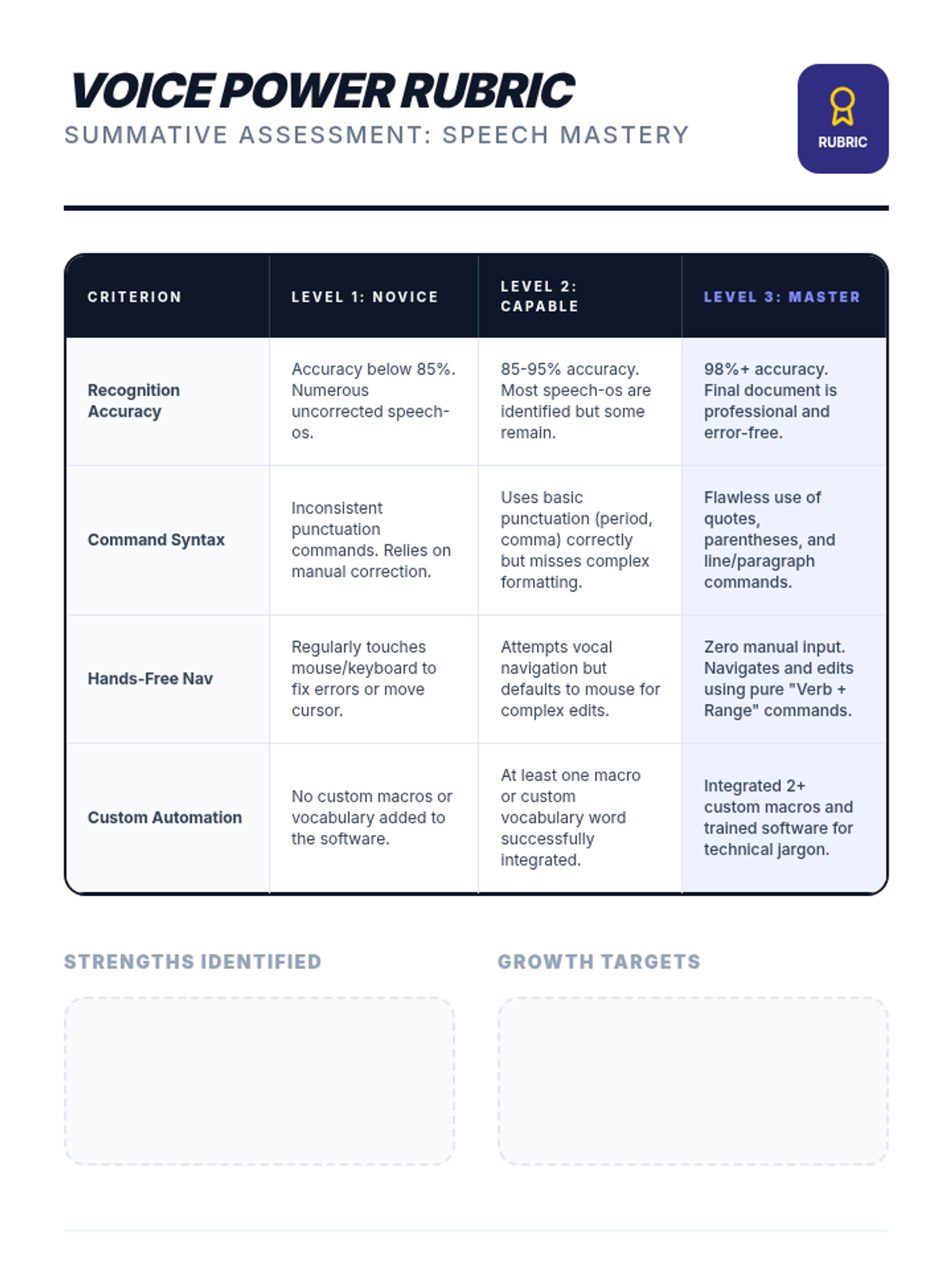 Students master advanced voice commands to edit and navigate text hands-free, increasing independence and efficiency in the editing process.