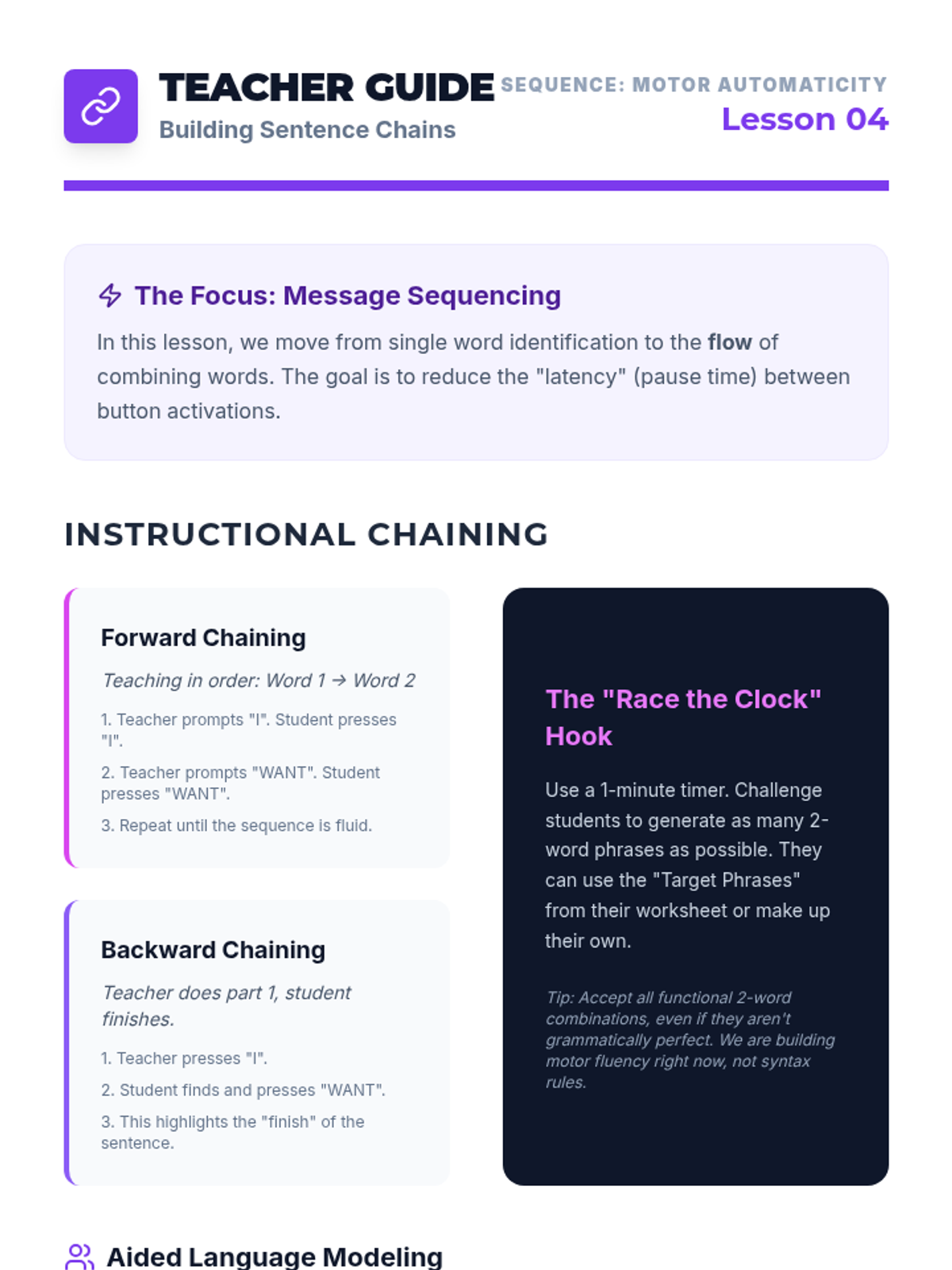 Students practice the motor patterns required to sequence multiple icons together, building fluency and reducing the time between activations.