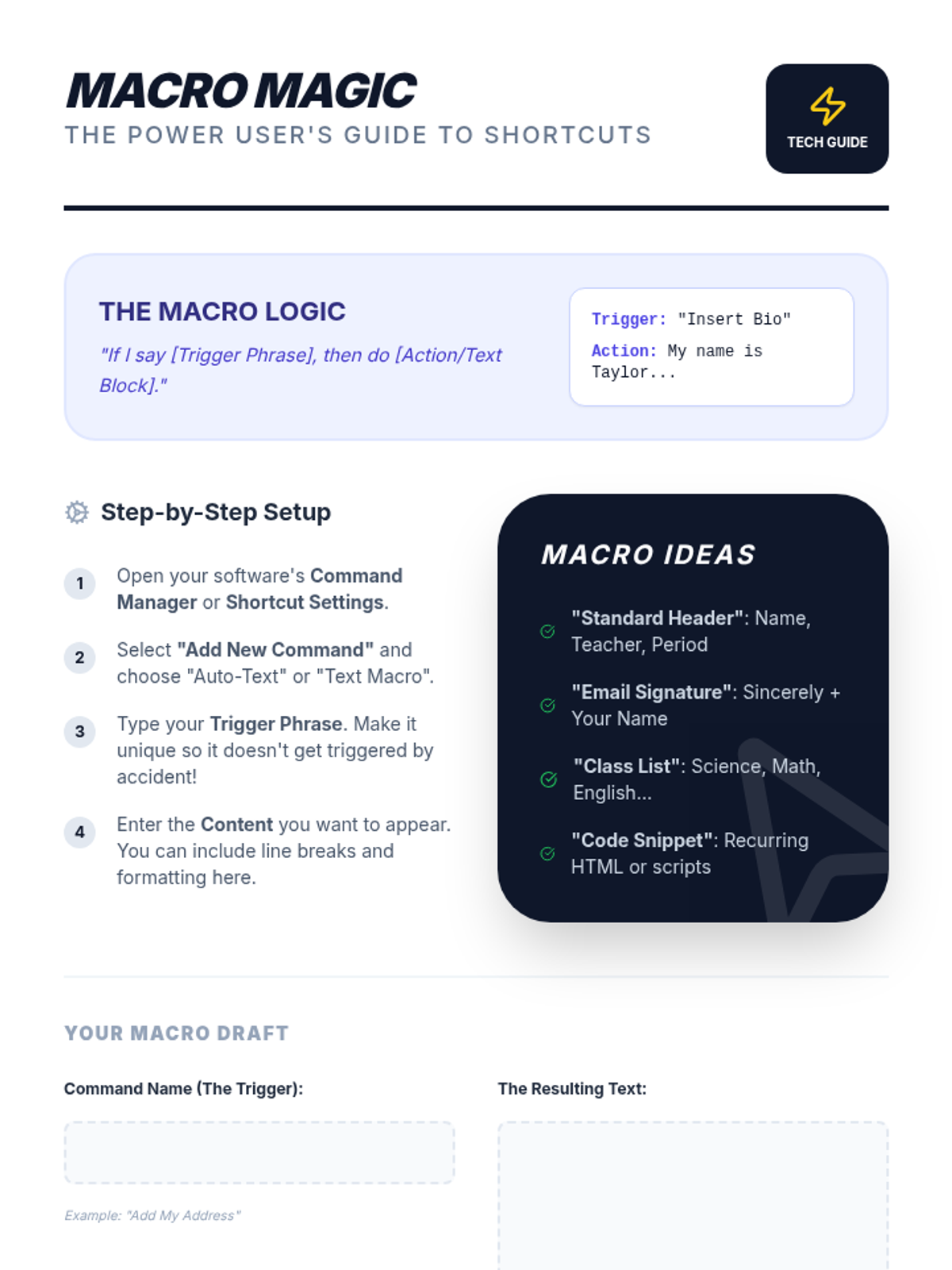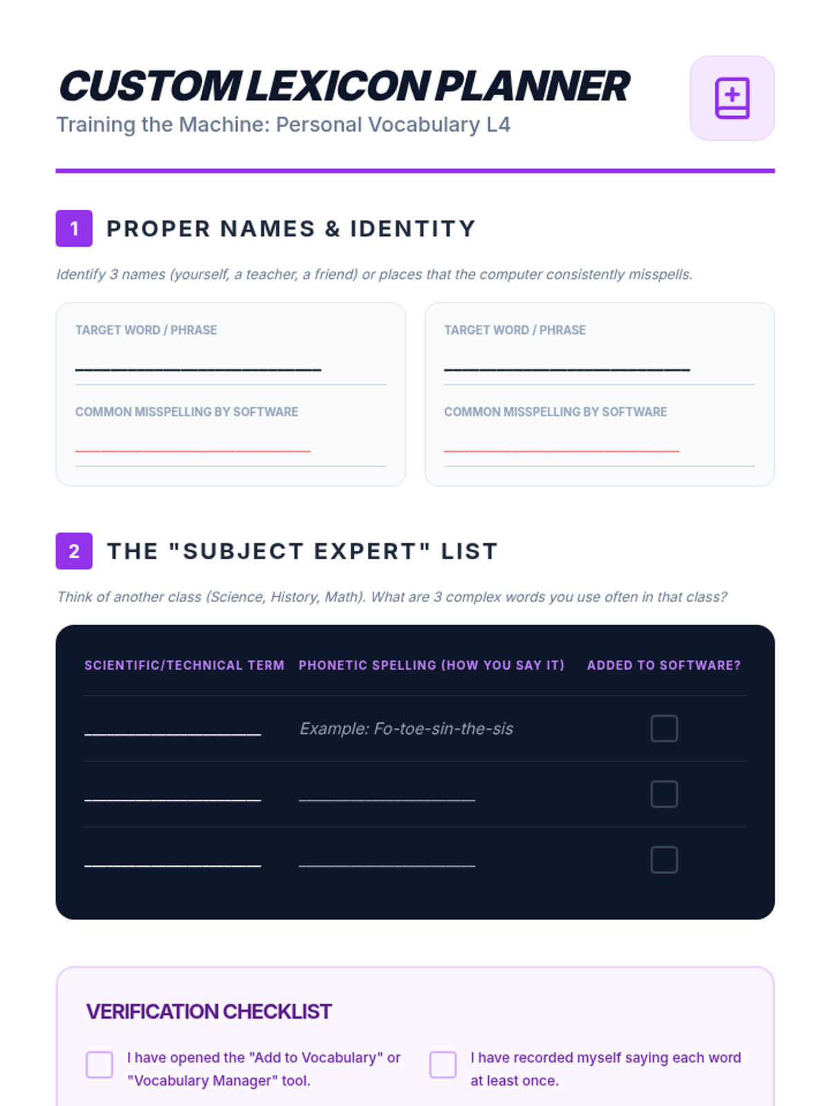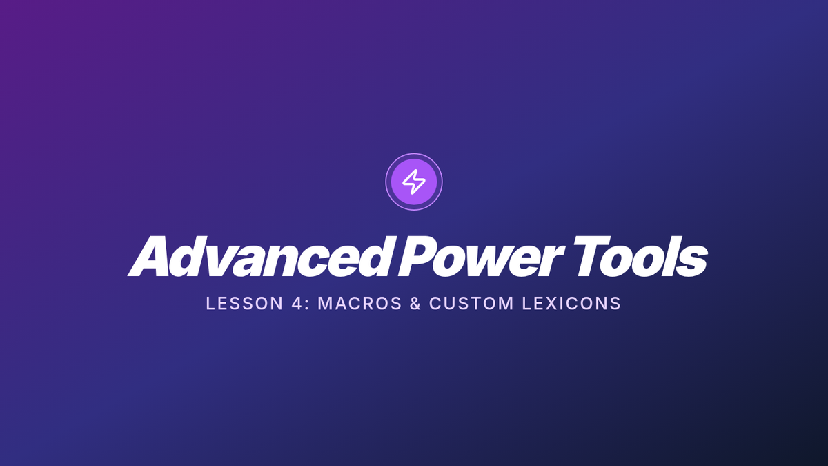 Students learn to add custom technical jargon and create voice macros to automate recurring tasks like signatures and headers.
