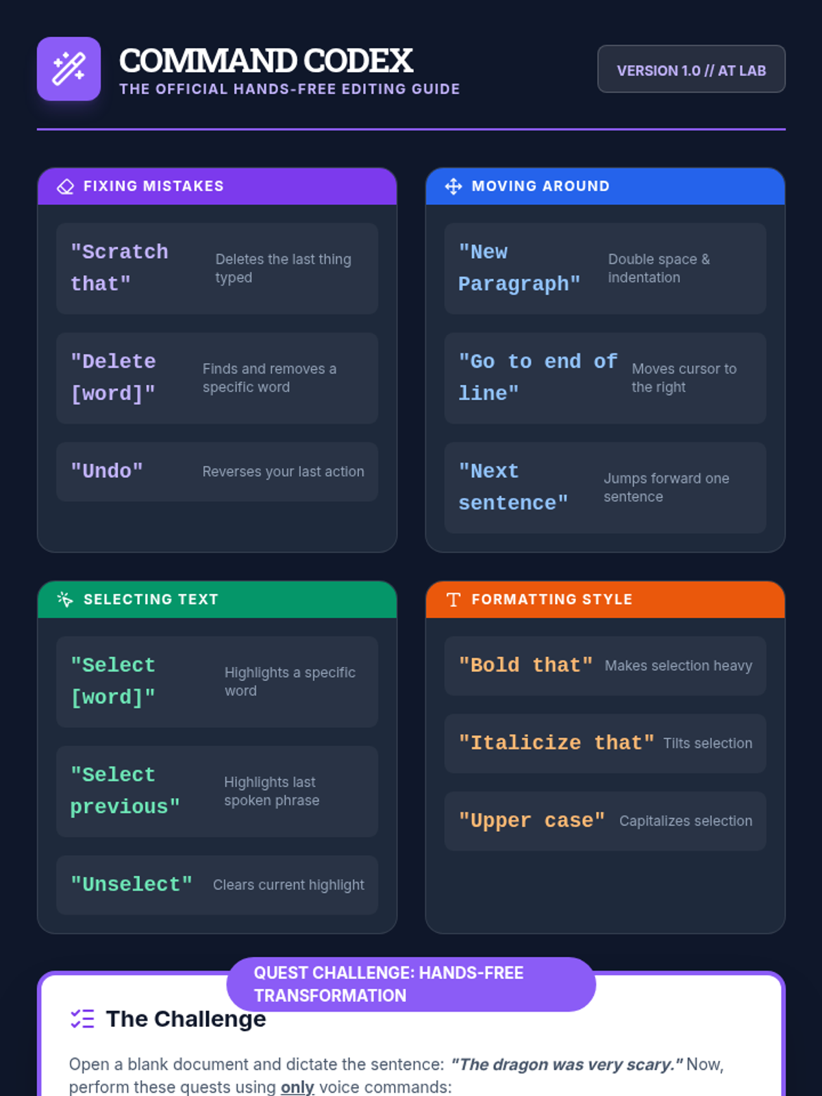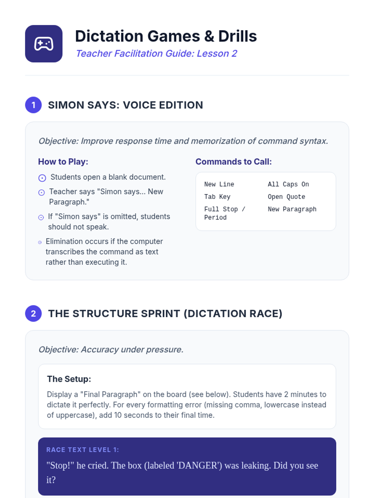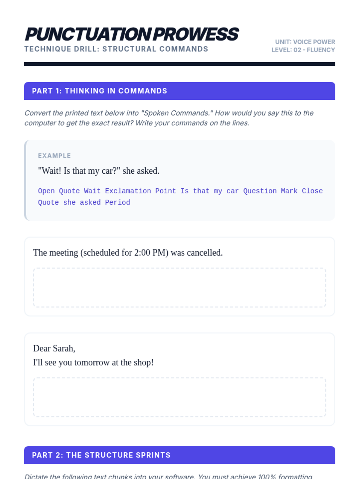 Develop drills and games for mastering voice commands for punctuation and formatting. Includes a 'Simon Says' style game for operational competence.