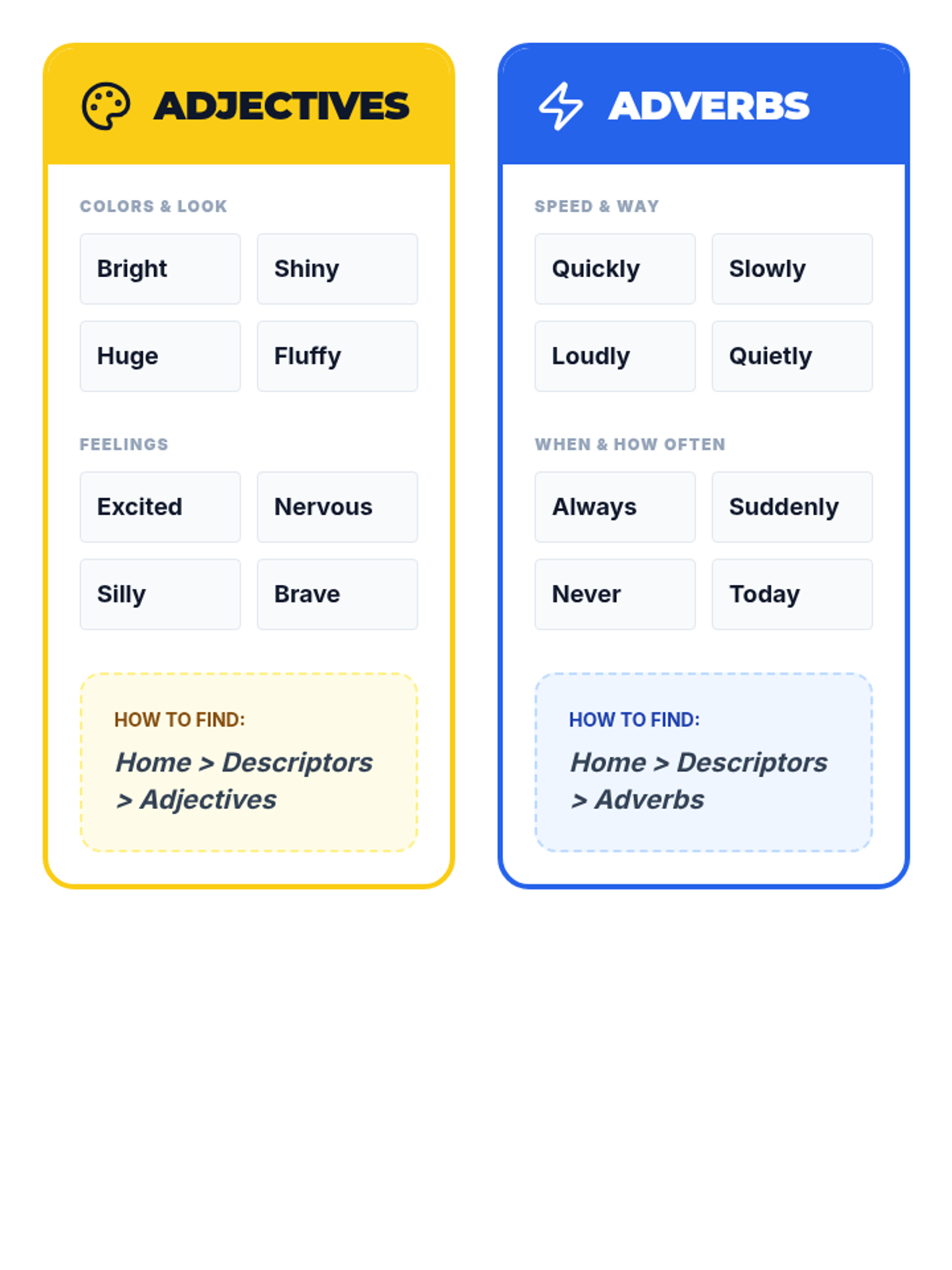 Focuses on expanding simple sentences by navigating to descriptive folders (adjectives and adverbs) to add depth and color to AAC communication.