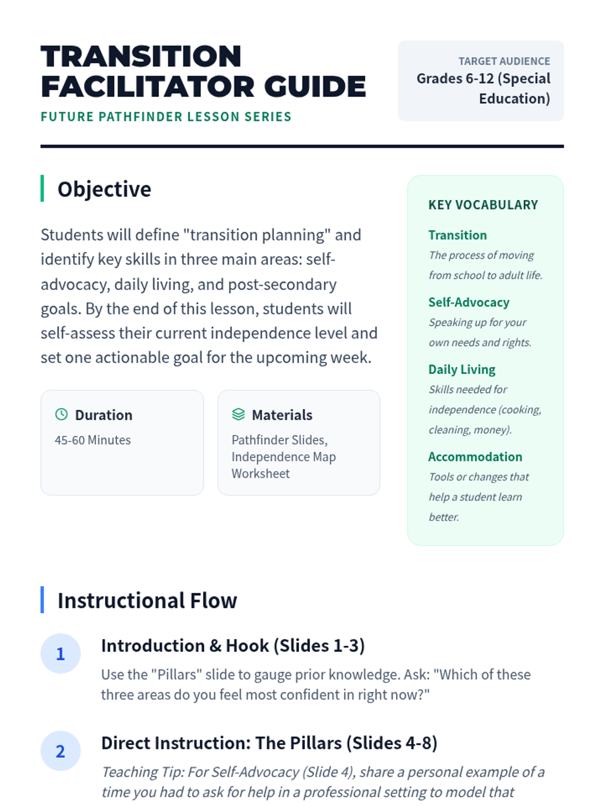 Empowering transition-age students with disabilities to master self-advocacy and self-determination. This lesson covers IEP navigation, workplace communication, and legal rights for life after high school through practical exercises and discussion.