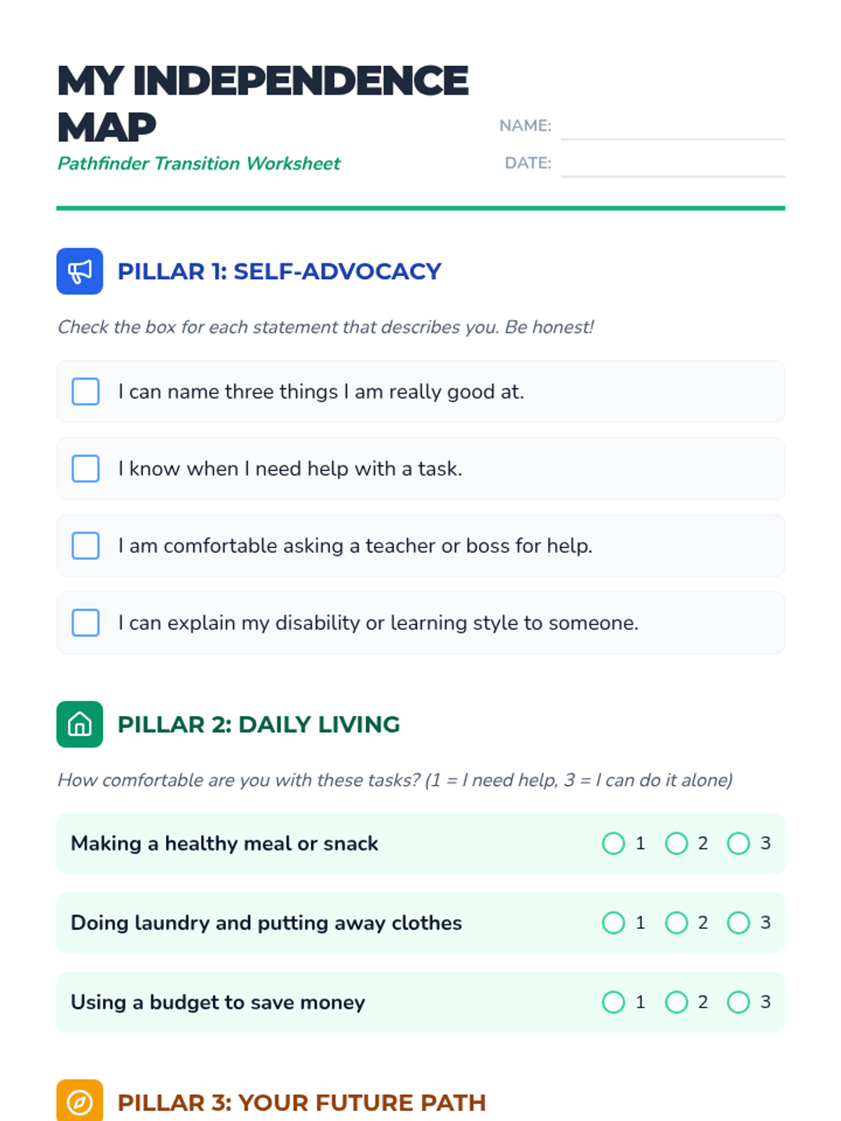 A comprehensive transition planning lesson for grades 6-12 focusing on self-advocacy, daily living skills, and goal setting for post-secondary independence.