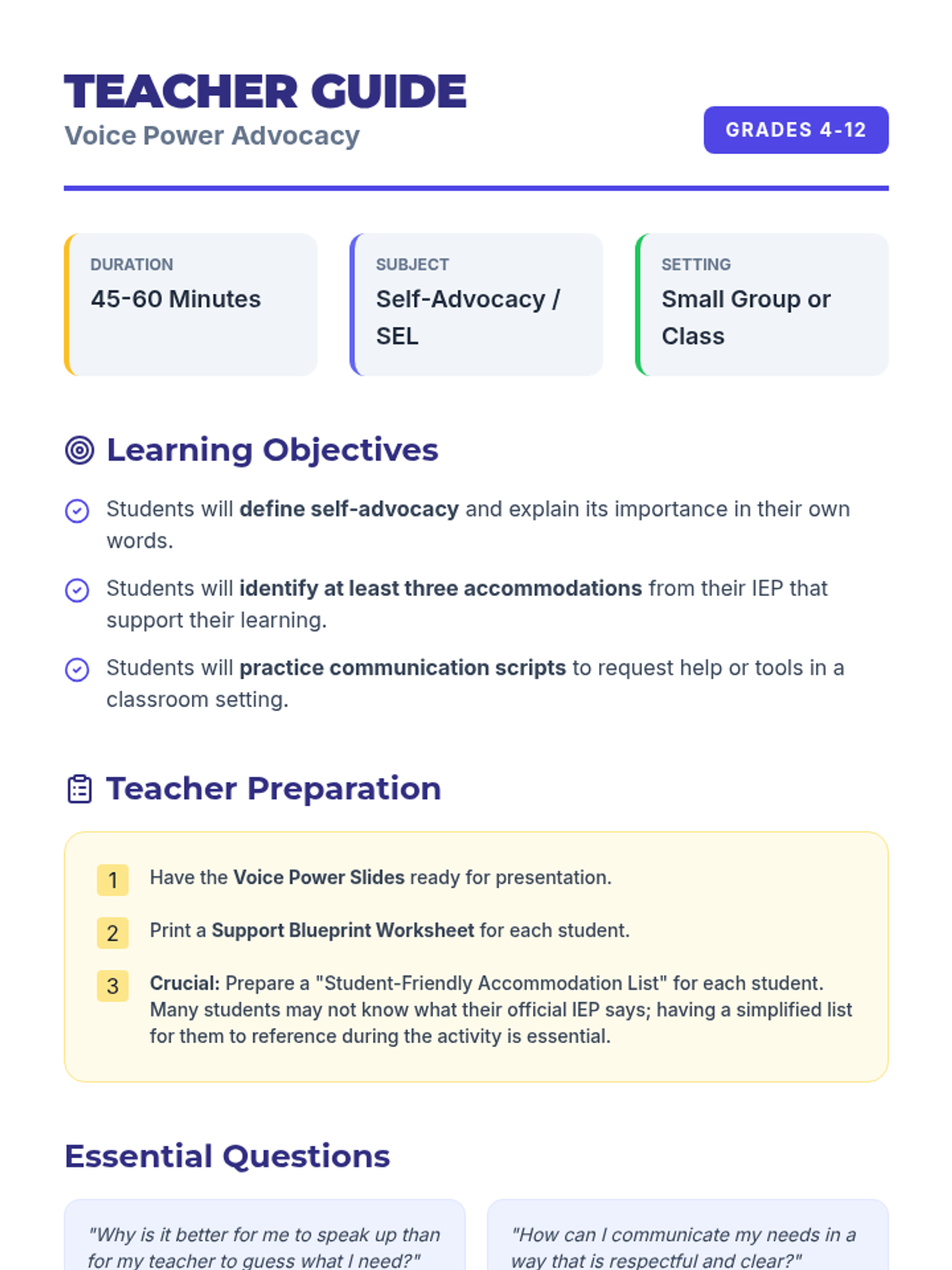 A comprehensive lesson designed for high school students with disabilities to master self-advocacy skills. Students learn about their legal rights under IDEA, how to identify and request accommodations, and practical strategies for active participation in their own IEP meetings.