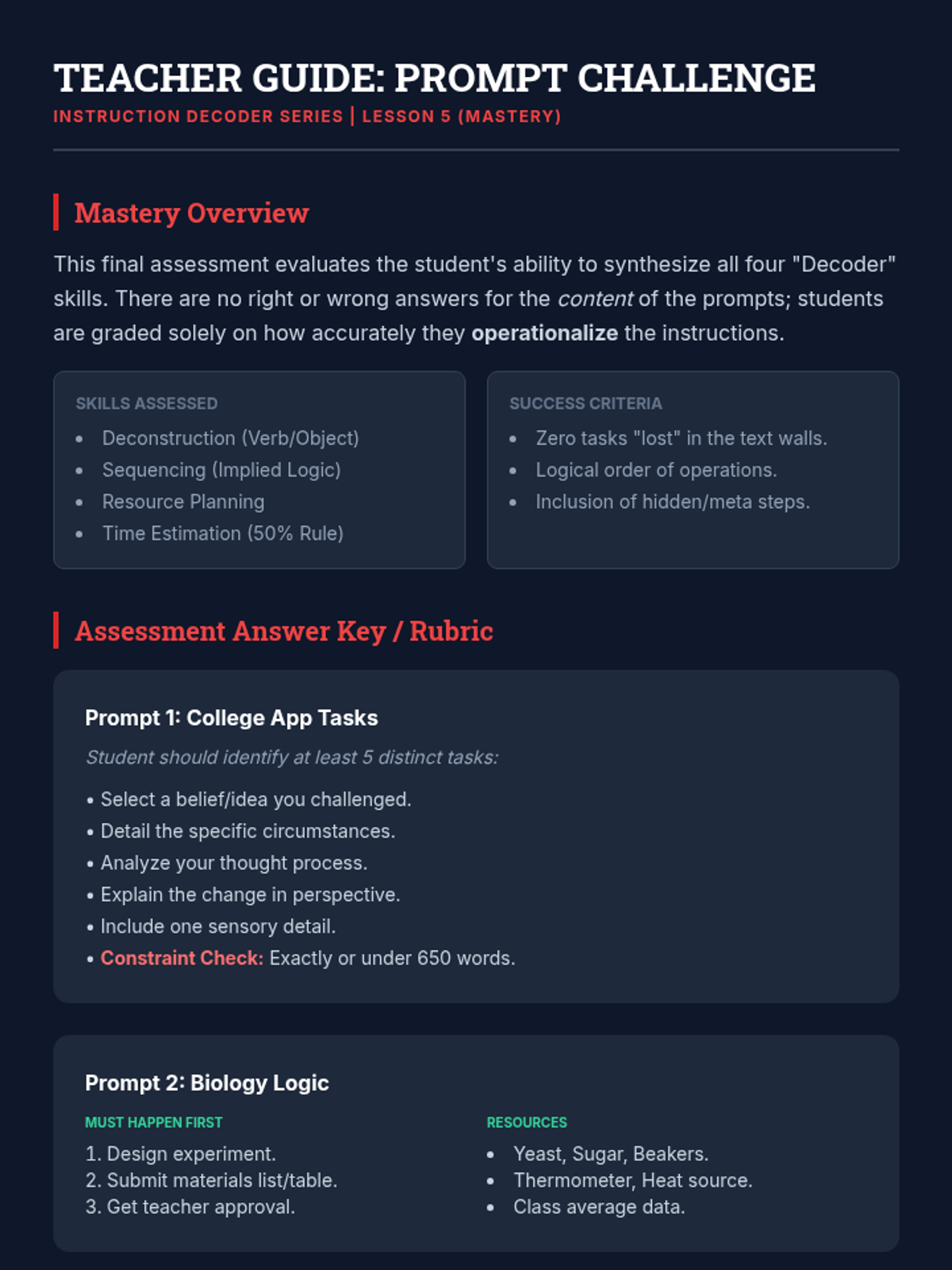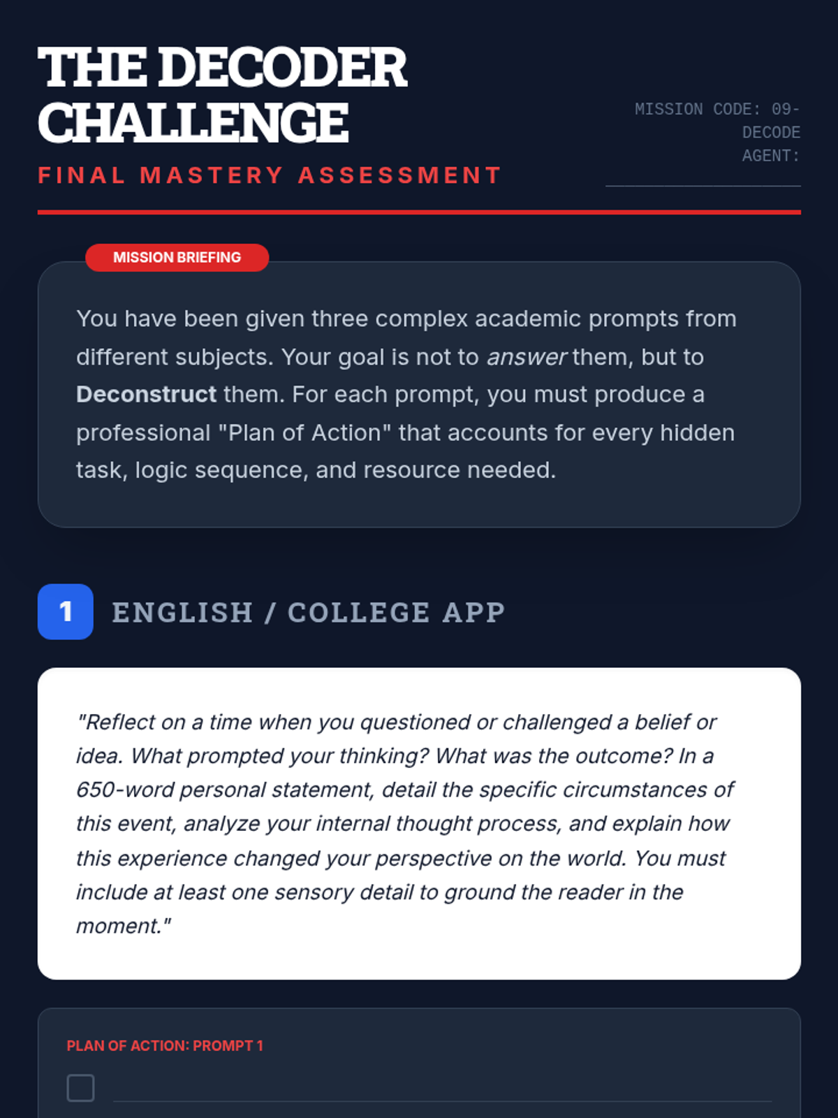 A mastery check where students apply deconstruction skills to high-school and college-level prompts, creating comprehensive 'Plans of Action'.